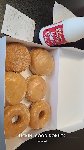 Licking Good Donuts: A Sweet Temptation Oh my goodness, Lickin Good Donuts in Foley, Alabama, is an absolute treasure! Licking Good Donuts in Foley, Alabama, is a delightful haven for donut enthusiasts. This charming bakery offers a delectable array of freshly baked treats that are sure to satisfy any sweet craving. From the moment you step inside, the mouthwatering aroma of warm, sugary goodness fills the air. The inviting display case showcases a tempting assortment of donuts, each more enticing than the last. Whether you prefer classic glazed, decadent chocolate-frosted, or creative specialty donuts, there's something for everyone. rom the moment you step inside, the aroma of freshly baked goodness wraps around you like a warm hug. Their selection is truly delightful, ranging from classic glazed to creative, fun concoctions that make your taste buds sing. Each donut is clearly made with love and attention to detail – they are perfectly soft, delightfully airy, and boast just the right amount of sweetness. The donuts themselves are a work of art, with perfectly fluffy dough and a variety of delicious toppings. The glaze is rich and smooth, the fillings are generous and flavorful, and the sprinkles are colorful and fun. Each bite is a pure indulgence, a sweet symphony of taste and texture. Beyond donuts, Licking Good Donuts also offers a selection of other pastries, such as croissants, muffins, and kolaches. These treats are equally impressive, made with high-quality ingredients and baked to perfection. The staff at Licking Good Donuts is friendly and attentive, always ready to assist with recommendations or special requests. The cozy atmosphere makes it the perfect spot to enjoy a leisurely breakfast or a quick afternoon pick-me-up. If you're in the Foley area, Licking Good Donuts is a must-visit. It's a place where you can indulge your sweet tooth and experience the joy of a truly...