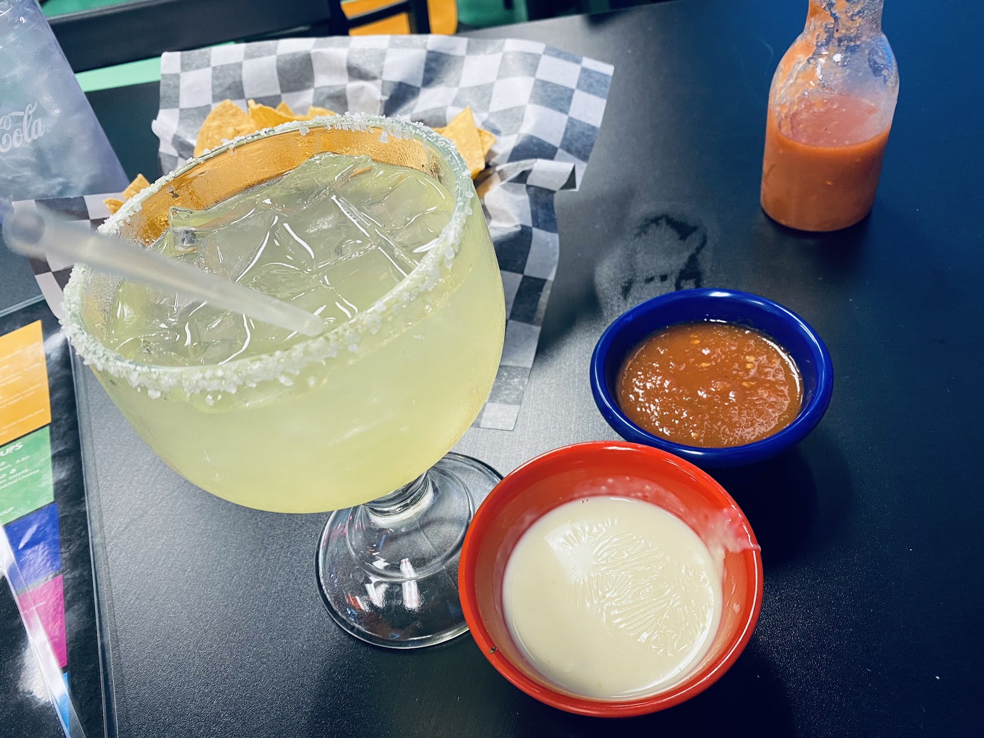 The menu's more or less traditional Ameri-Mex type cuisine; while there are a nice handful of tacos to choose from, there's also a full menu of other standbys like quesadillas, burritos, fajitas and all that mariachi.