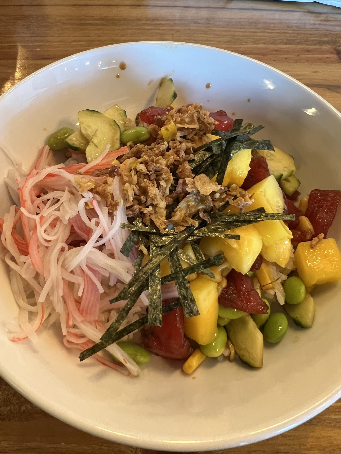 We ordered the standard tuna bowls and a 3-protein custom bowl. We all noticed that you get less food here than the other Poke place, and maybe they use less protein overall? It was less filling for sure. Everything seemed fresh though, and I liked the mango in the tuna bowl, great summery touch. We also got crepes, and those were really big. I think 1 savory crepe would be a good meal, since we couldn’t even finish one of the sweet ones between the 3 of us. Overall, it’s a great and cute place, but if you really want a big filling meal, the other place will probably be more bang...