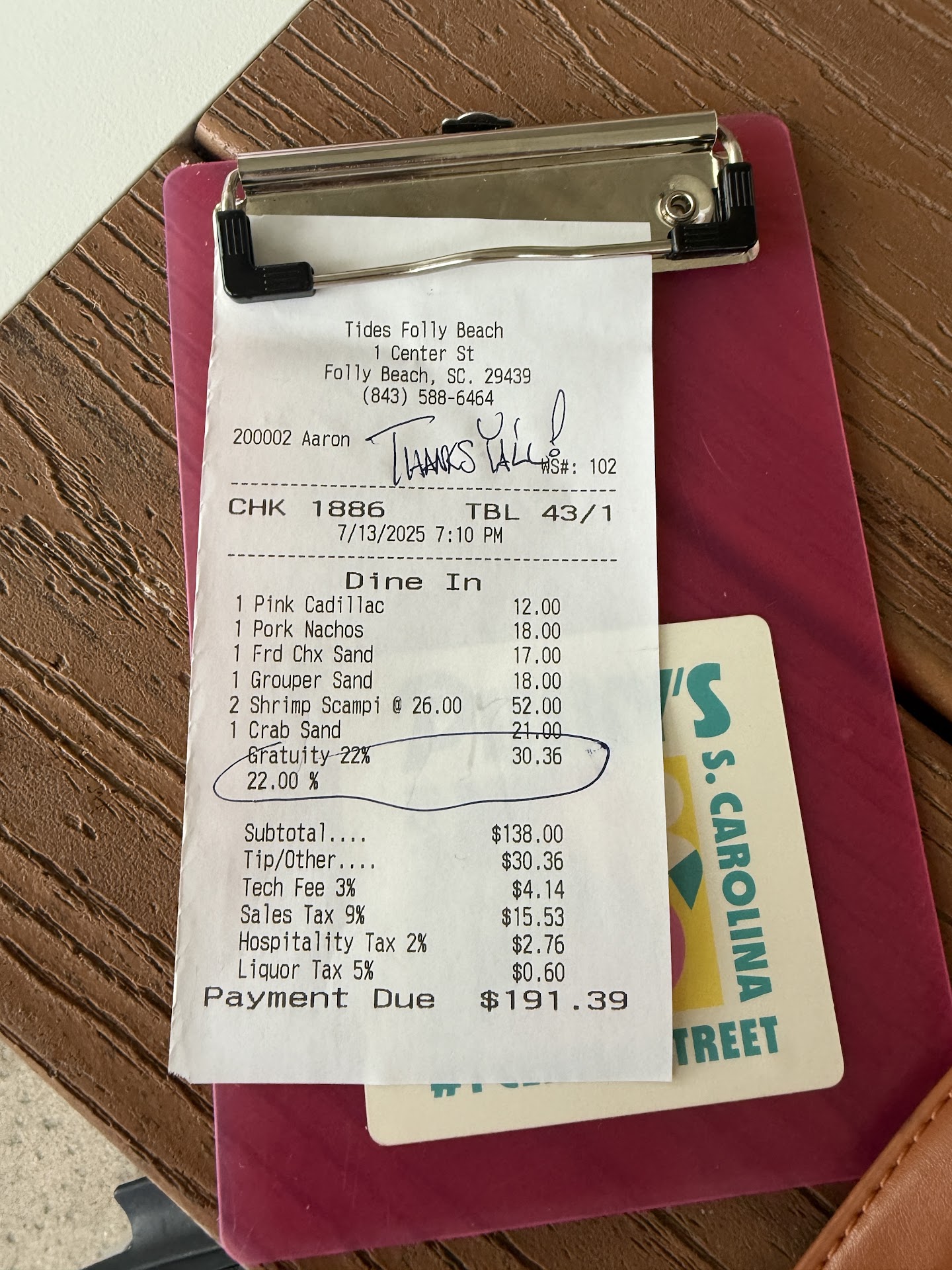 My friends and I visited folly beach for a bachelorette party and decided to try out pinky’s since it was right on the water and had live music. Immediately we noticed for a Saturday night the place was almost completely empty with the exception of a few outdoor tables including our own.