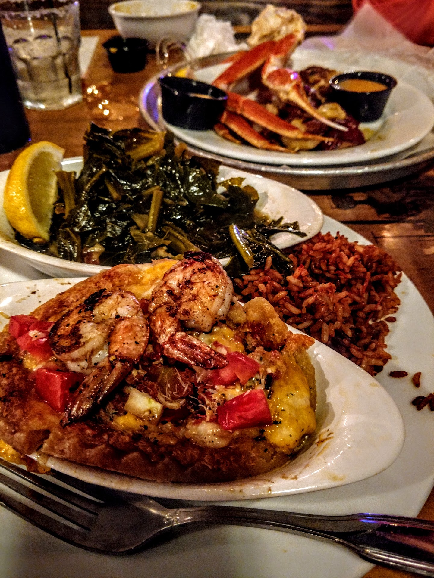 This time we both decided to go for the Fried Shrimp & Flounder Platter. Again, the seafood was delicious. However, the collards and red rice were inedible. The rice was dry, and if ruining collards was a crime, this would have been a felony. I am a regular salt user. I even use salt pork in my collards. These collards tasted like someone knocked a five pound bag of Morton's into the collard pot. I'm pretty sure we both hit our salt intake for the year in just the few bites we were able to get down. If we'd had a microwave in our hotel room, we would have asked to sub out those two culinary fails with something else. As it was, leftovers were not an option, so the shrimp and flounder portions were generous and filling enough for our needs.