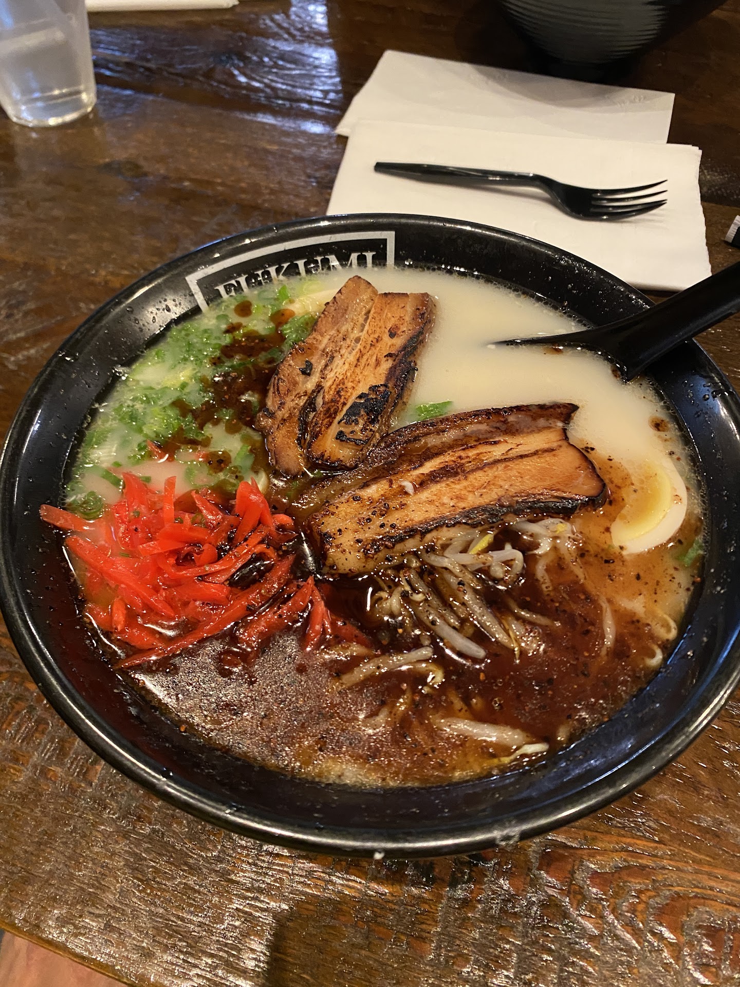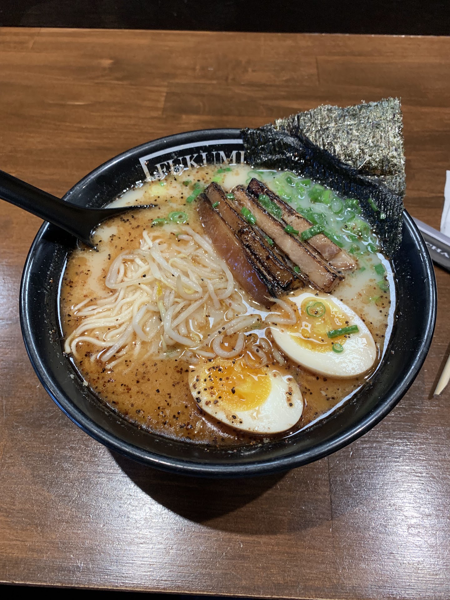 Read moreFirst time eating at Fukumi Ramen. I ordered the titular Fukumi ramen, which featured a salt tonkotsu broth with extra pork chashu and black garlic oil. The first couple spoonfuls were great, since the sweet char of the chashu and the garlic flavored the broth amazingly, but the more I dug into the ramen, the more I wished for something to cut the richness of the meal.