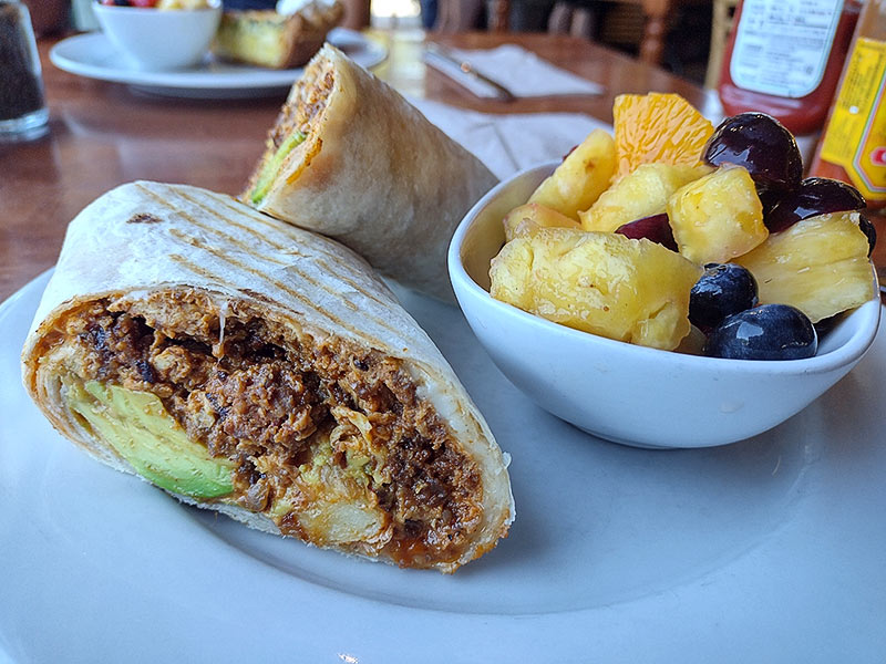Friendly staff, nice indoor/outdoor seating, food was just ok. It says something when the bowl of fruit was more exciting than the entrees. Stopped by on a Saturday around 11am and this place was slammed — line going out the door kind of busy. (TIP: Figure out what you want to order and then send someone from your group to go snag a table while waiting in line.) The Broccoli & White Cheddar Quiche had a strange crust — chewy rather than flaky. It needed a hit of salt and pepper to give it some flavor. Would not order again. The Grilled Chorizo Breakfast Burrito reads beautifully on the menu but eating it was a different experience. For about 3/4 of the burrito everything had the same soft, almost minced texture until you come across some nice chunky potatoes. Sliced grilled chorizo sausage might solve the texture issue. It was filling but could also use some seasoning to give it more layers of flavor - fresh chopped parsley or cilantro would help. At $17.50 it did not hold up. With how popular they were and the high ratings we may have just picked the wrong items on the menu? Next time we will try some of their other options.