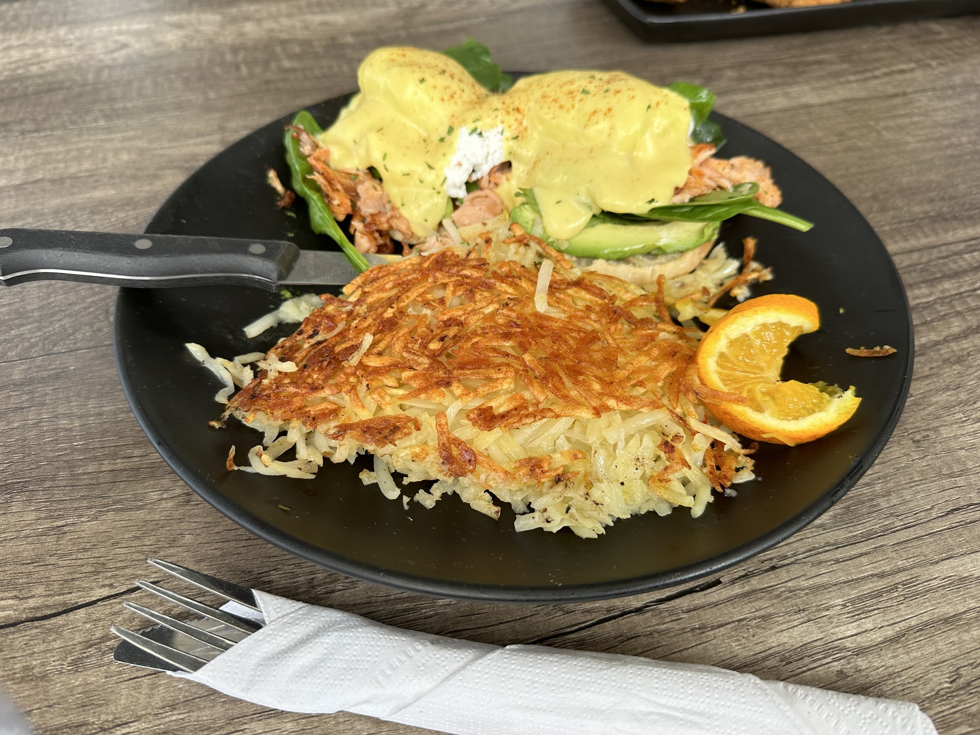 Smoked salmon benedict: the portion was generous. The eggs were poached perfectly (the yolk still runny). They gave generous pieces of smoked salmon & avocado! The hollandaise sauce was good too. The hash brown was crispy but a tad too salty for me. A good solid benny! Riley chicken tender & fries (kids meal): the four pieces of chicken tenders were crispy yet tender. The fries were good and had generous portion.