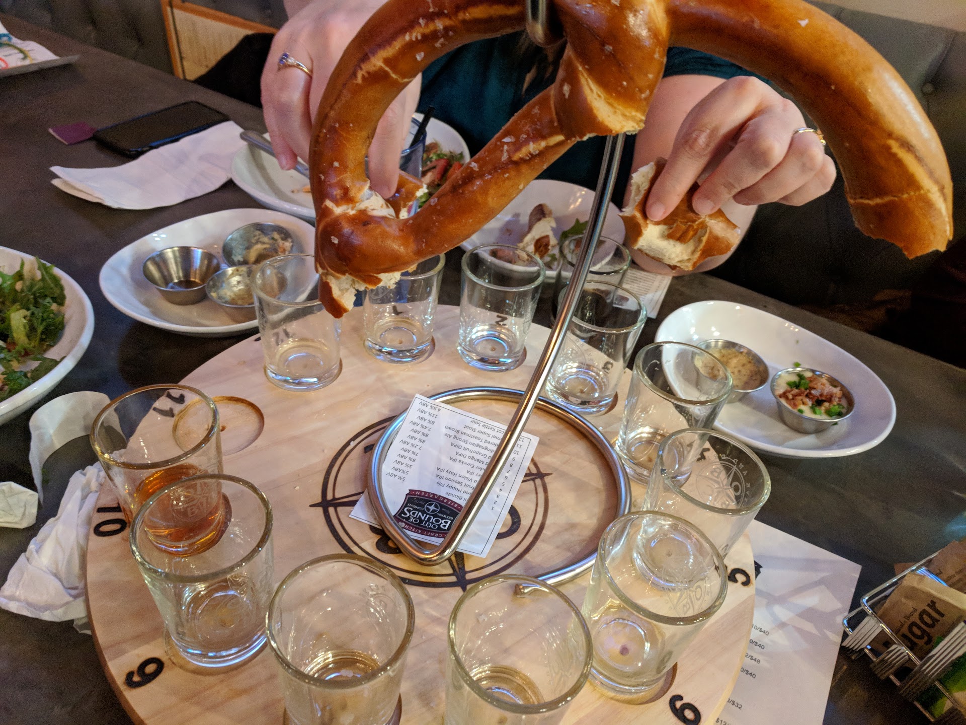 The place was packed and there was a wait for dinner and a table, it was expected since it is a newer establishment. (understandable) We opted to sit outside immediately and relax in the Adirondack chairs by the fire-pit/cornhole area. (I genuinely enjoy relaxed/comfortable seating.) it was a little confusing wether they would come around and take our orders or if we had to do it ourselves at the bar. We finally went to the bar after 15min of waiting for someone to take our order. They have a great variety of craft beers, I am a dark beer drinker and the Graham Slam Graham Cracker Nitro Stout was excellent. (the only dark beer choice) after the first round we ordered some appetizer. The Hangry chicken wings Bloody Mary style were some of the best wings Iâve ever had. Giant pretzel is huge and delicious, and smoked Mac n cheese was pretty good too. 2nd round we all shared the beer flight. Pretty interesting flavors of beers everyone seemed to enjoy.