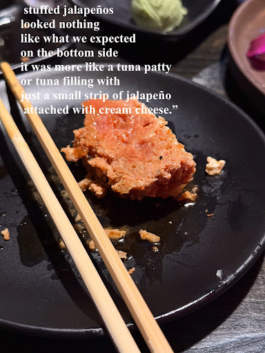 Unfortunately, this time was a huge disappointment. We ordered four different sushi sets and the Jalapeño Pops appetizer. The appetizer was described as jalapeños bombs, but what we got looked like a tuna patty with a tiny strip of jalapeño stuck to it with cream cheese. It was not appetizing at all and completely killed our appetite. Pls see my picture.