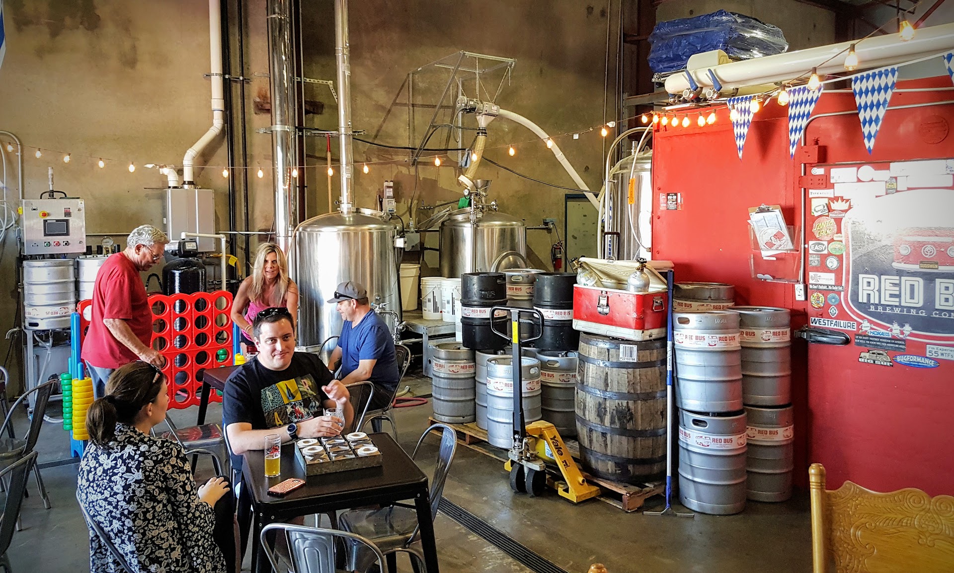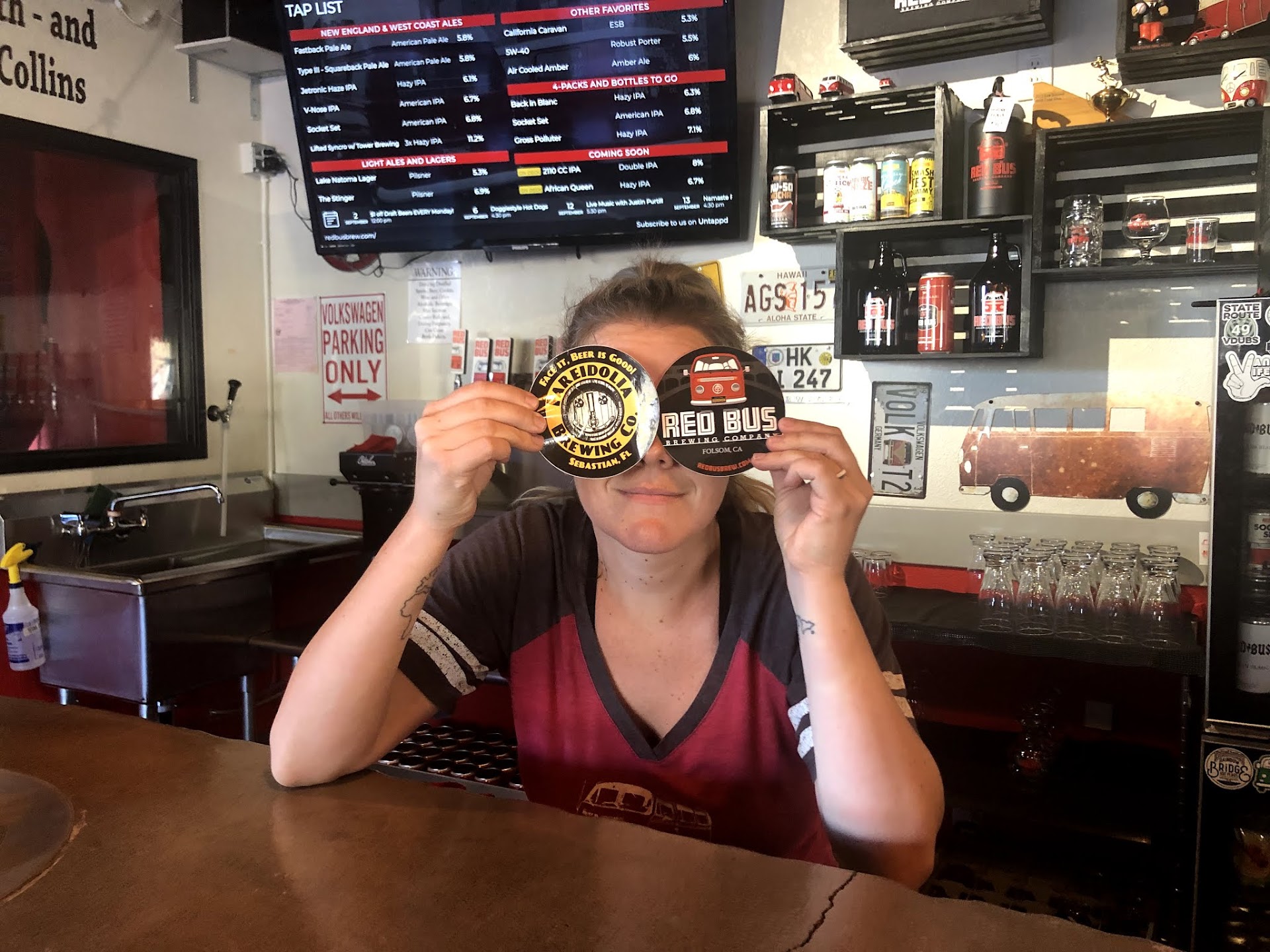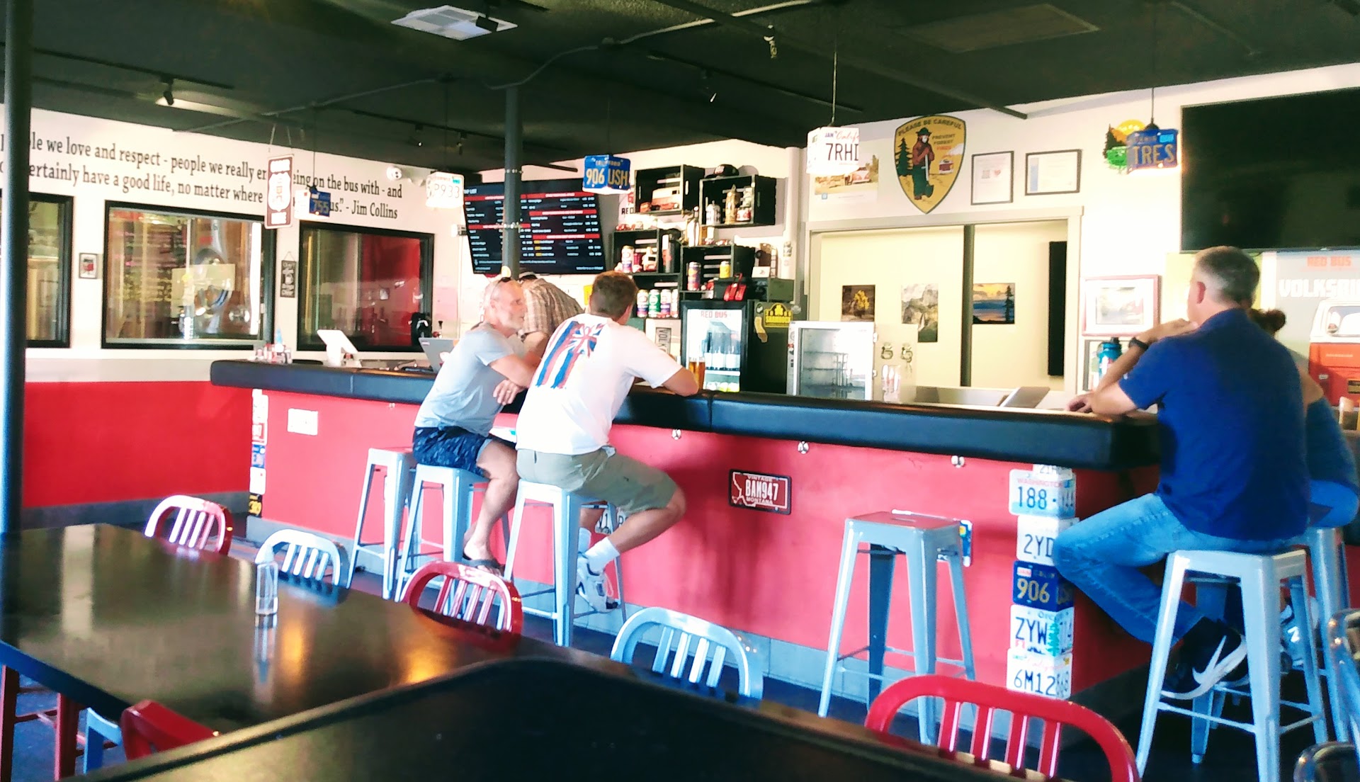 Read moreA stroll along an unassuming neighborhood street reveals this little brewery, tucked away! As the first brewery in the Folsom city limits since the mid-1800's, Red Bus are making a magnificent mark on this rapidly growing city. Took a seat at the tire lined bar in a vibrant Volkswagen themed room with tags as lights and the tail-end of a VW wagon sticking out of a wall. The hum of the neighborhood vibe was fueled by no TV's (YES) and just a buzz of great conversation, laughter, and a feeling of a place where everyone knows your name. And Steph behind the bar - knew pretty much everyone who came in and everything about the beer! Sampled the fresh on tap Fastback Pale Ale (like a wee slice of lemon meringue pie) , the popular with the public Jetronic IPA, popular with the staff California Caravan ESB, and ended up with a 5W-40 Porter. All absolutely delicious - perfectly balanced and clearly brewed with care and love! Get yourself here, chat with the locals and with Stef...and leave with a crowler of yum (they have 6-packs too). And if you are lucky - you might get a wee message on your crowler too! Looking forward to coming back soon! Get here...it's not to be missed! ...