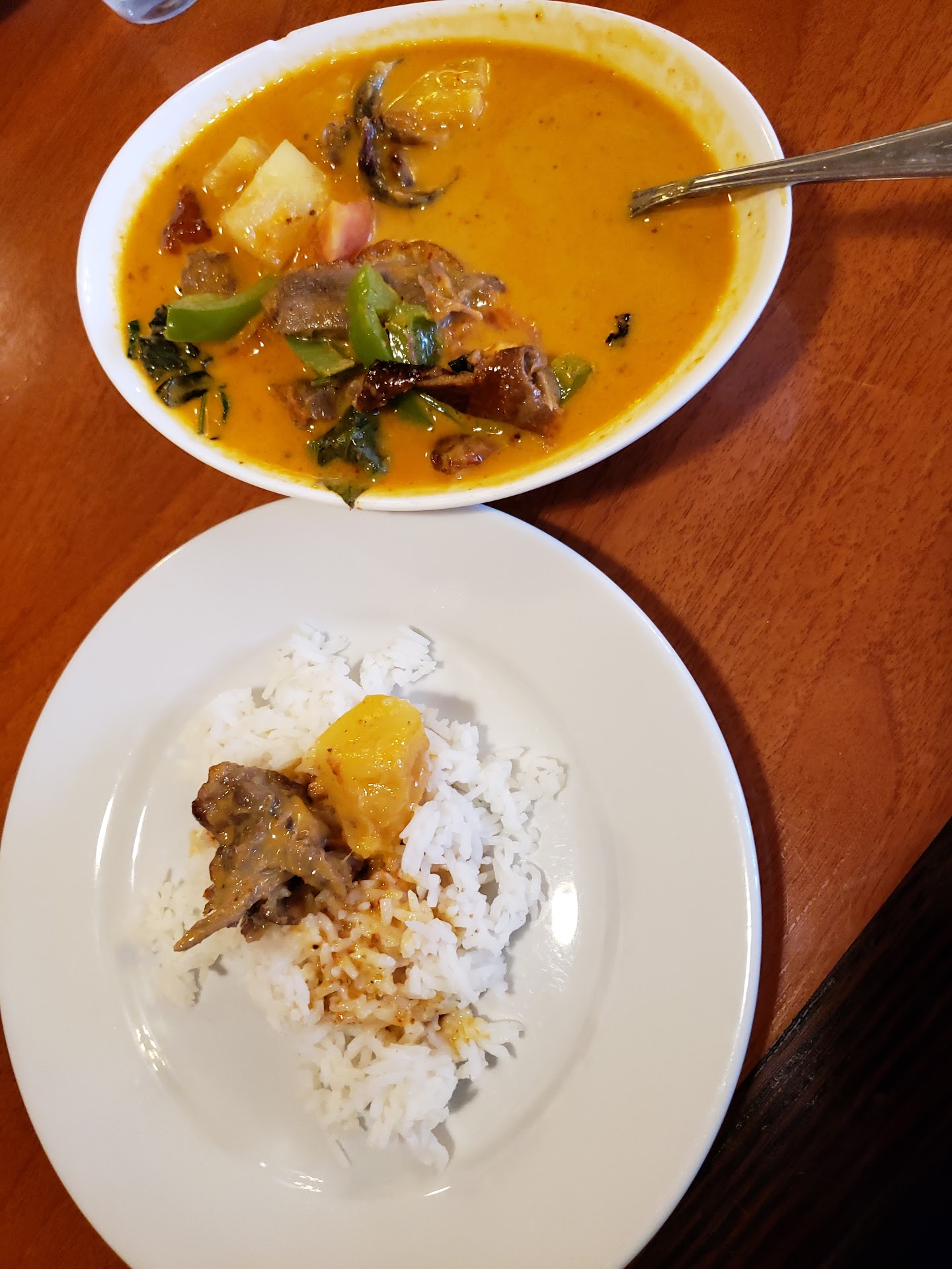 The pumpkin curry has whole vegetables in it and is very hearty and has depth. Creamy but the spice level is whatever you ask for. All the ingredient are fresh. Full siqe shrimp! He says it's the best pumpkin curry he's ever had.