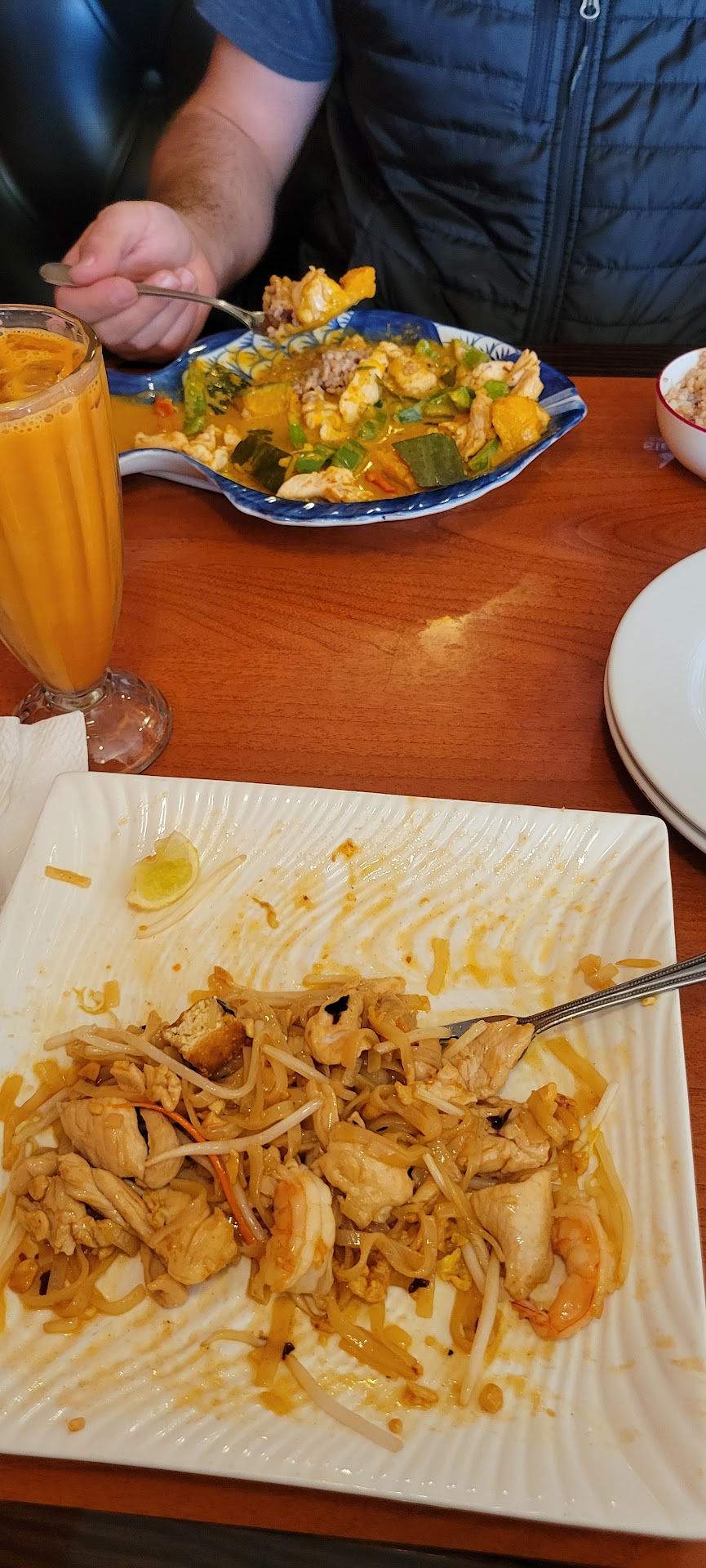 I always get pad Thai, and my husband gets pumpkin curry. The shrimp they use are large and tails removed. The chicken is never dry. The noodles are perfectly cooked. They use just the right amount of sauce for the pad Thai.