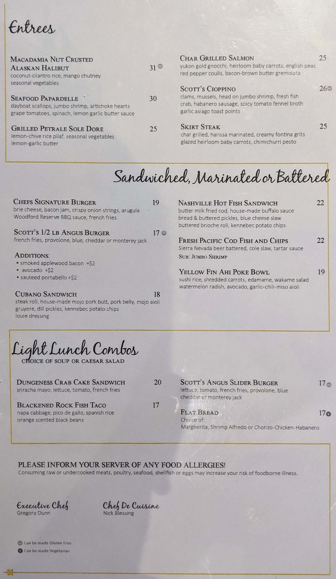 Read moreMe and my husband have been eating at Scott's Folsom for the last 15 years. It has been always our favorite restaurant! We had anniversary dinner yesterday and I must admit, we were completely disappointed! We had fresh oysters, which were good since you can't really screw up oysters (but disappointed because there was no selection, only one type of oysters). Then we ordered Oysters Rockefeller, which are our favorites, but not this time! They wre absolutely horrible. The new chef completely changed the recepie and added bread crumbs to it. Tasted horrible, barely any spinach, no cheese! They should supposed to be creamy!!! For dinner my husband had wayagu steak which was burned and literally looked like a sliced tri tip which I grill on my backyard (and tastes way better), not to mention that mashed potatoes were completely blend and asparagus was undercooked. I had Swordfish schnitzel which was also burned and served on the parsnips and spinach puree which was swimming in cream and tasted like nothing. Service was also horrible! Our server Elizabeth seemed like she doesn't know what she was doing and where was she at. My husband ordered a glass of wine, and she came back after few minutes and said that they don't have it on the menu anymore! Seriously? How didn't you know that you guys don't sell this wine at the moment my husband placed an order. Then she dropped chop sticks on our table and left? What? Should I suppose to use them to eat oysters? She didn't make any recommendations as far as food, wine, never really checked with us, and took forever to place an order! Anyways, we spend $315 for dinner plus $70 tip (we are both in the business so we are always pretty generous) for the meal and experience which was definitely not worth it and completely disappointing! It's been great 15 years Scott's! We definitely won't be back! Why change the awsome menu which worked well for so long, to serve...