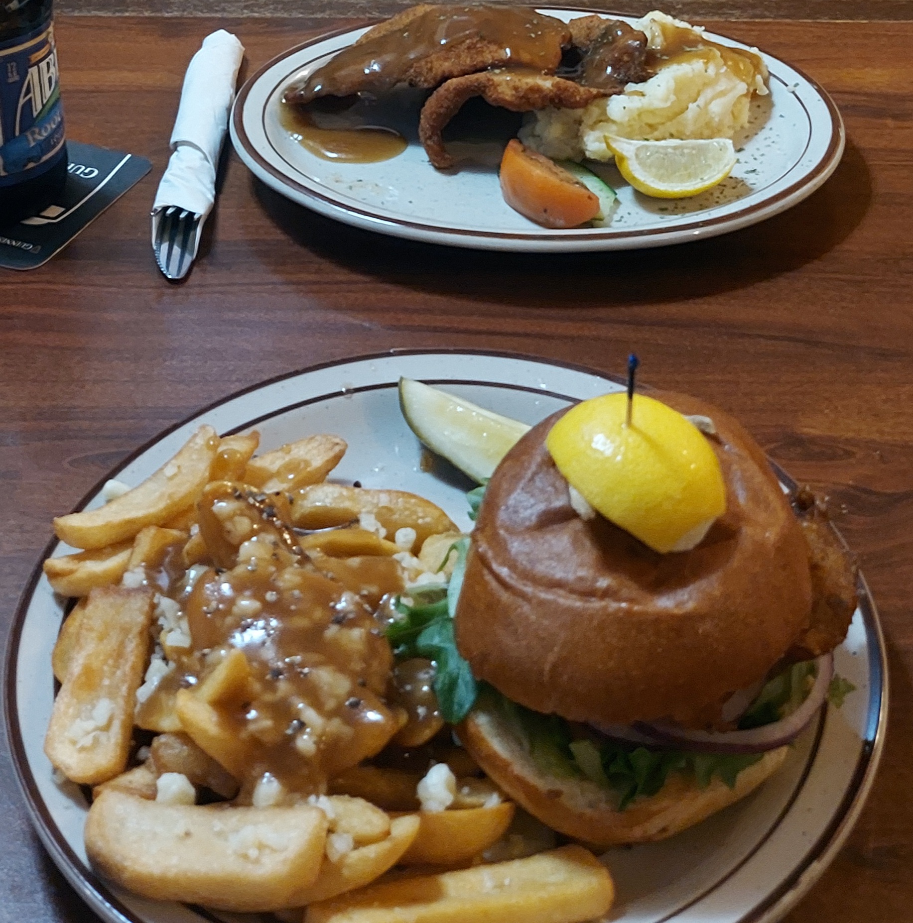 The menu has several traditional pub foods which was nice to see and as well as some extras. We ordered a fish sandwich with fries upgraded to poutine style and the special: pork schnitzel, and bottled root beer.