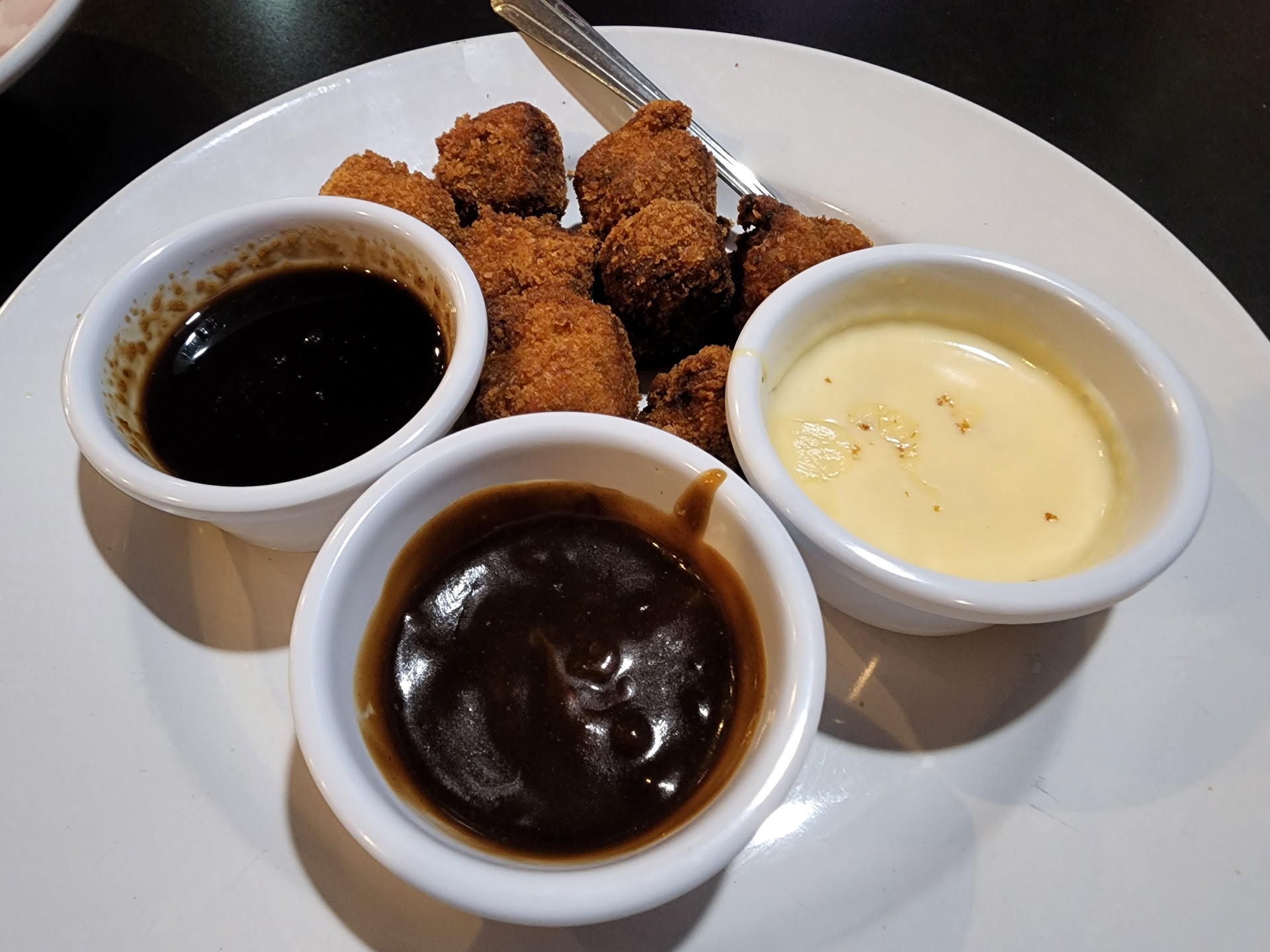Aside from the aforementioned soup, I also had Breaded Meatloaf Bites ( yes, you read that correctly ! ) and Sweet Potato Fries. Meatloaf is one of those things that both my wife and my mom make WONDERFULLY, so getting it at a restaurant is sometimes a let-down because it never quite lives up to what I can get home-made. I'm glad to report that this instance was an exception. These things were QUITE good...and the three dipping sauces that came along with them were quite tasty, too. The fries were nicely seasoned, slightly sweet and lightly crunchy, which is pretty much just how I like them. The waitress was very pleasant, didn't hover and came back to the table with appropriate regularity.