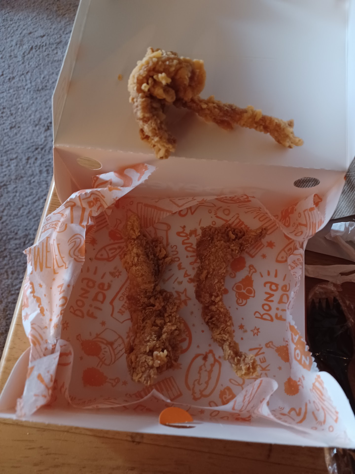 When we opened the food, we discovered we'd actually been jilted two biscuits from our order, anyway. So, on all levels, Popeye's failed. I love the food, but I don't think they're getting my business back anytime soon. At least, not until they get a...