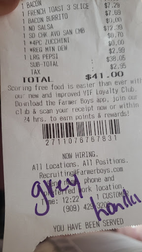 Read moreWhere do I start... I ordered $41 worth of food @12:22p on June 5th. I told the drive thru cashier I wanted the French toast platter, 1 bacon burrito, 1 chicken avacato combo with zucchiniand a Mt. Dew, a large Pepsi on the side and a side order of French toast on the side as well. She read it back and it was correct, when I get to the window first off they don't take apple pay so we paid with the apple credit card then she tells us to wait in the front so they can bring it out. After a couple minutes later she came out and read the order as French toast and bacon burrito. I knew i should of checked it because this isn't the first time they got my order wrong. When I got home I was going through the bag of food and they gave me a cake plate with pancakes not French toast. My mom doesn't eat pancakes and they have us the wrong platter. I switched my meal with her and I couldn't even eat the pancakes because they were burned on one side. So now I wasted money on food that I couldn't eat and this isn't the first time this has happen. I don't know if the cashier is incompetent or doesn't hear well but one thing is don't mess up on people's food. Learn the menu and repeat the order back to the customer when they get to the window to pay. Farmer Boys needs to step up on customer service and food accuracy because this is really unacceptable. If I could leave negative stars I would and a little advice to customers going through the drive through make sure you check your food before you drive away even if you have to hold...