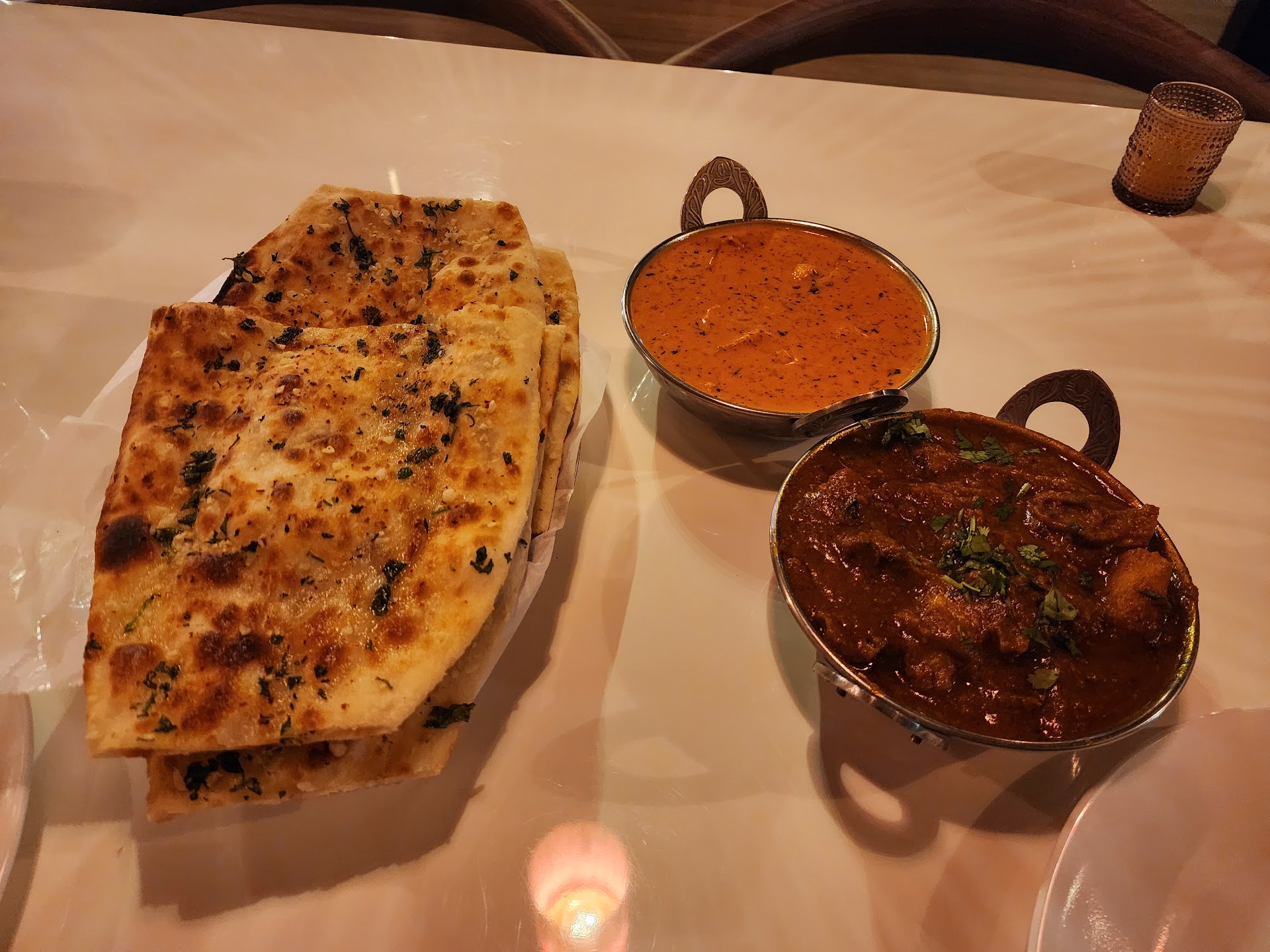 We paired both dishes with their garlic naan and mangonade (mango lemonade), which turned out to be the perfect accompaniments. The naan was soft, buttery, and garlickyâideal for scooping up every bit of sauce. The mangonade was refreshing and added a sweet, tangy contrast to the spicy dishes.