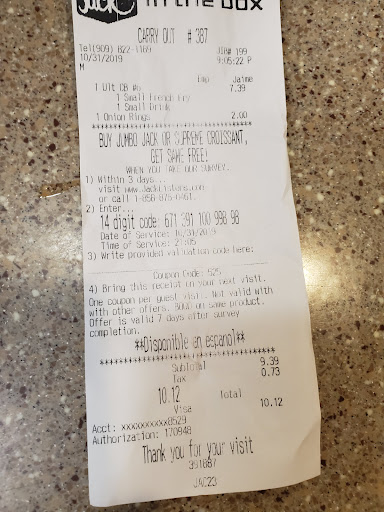 Ā Ā Ā Read moreEvery time I order from drive thru always something is missing in my order, I don't know if is employee business or what happen last time I ordered 4 tacos and they charge me 4 orders it was supposed to be 8 tacos, in my order it was only 4 tacos in my bag, I went back to complain about it and I wasted my time and gas for that, the time previous to that I got orange juice missing in my order, by the time I noticed I was about 10 miles away and I have to stop somewhere else to buy something to drink and I spending double on drinks, so I don't recommends to buy from drive thru from jack in the box, you will lost your time, your gas, your money and...