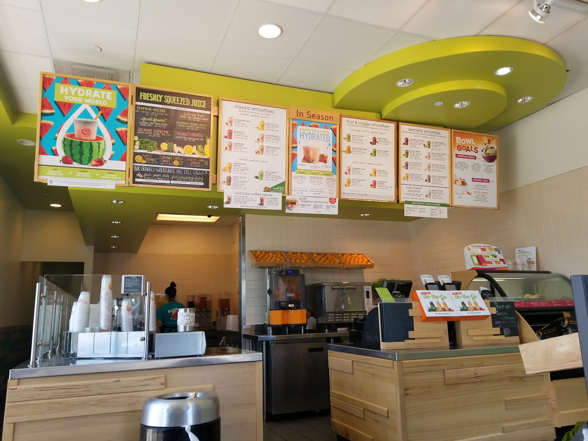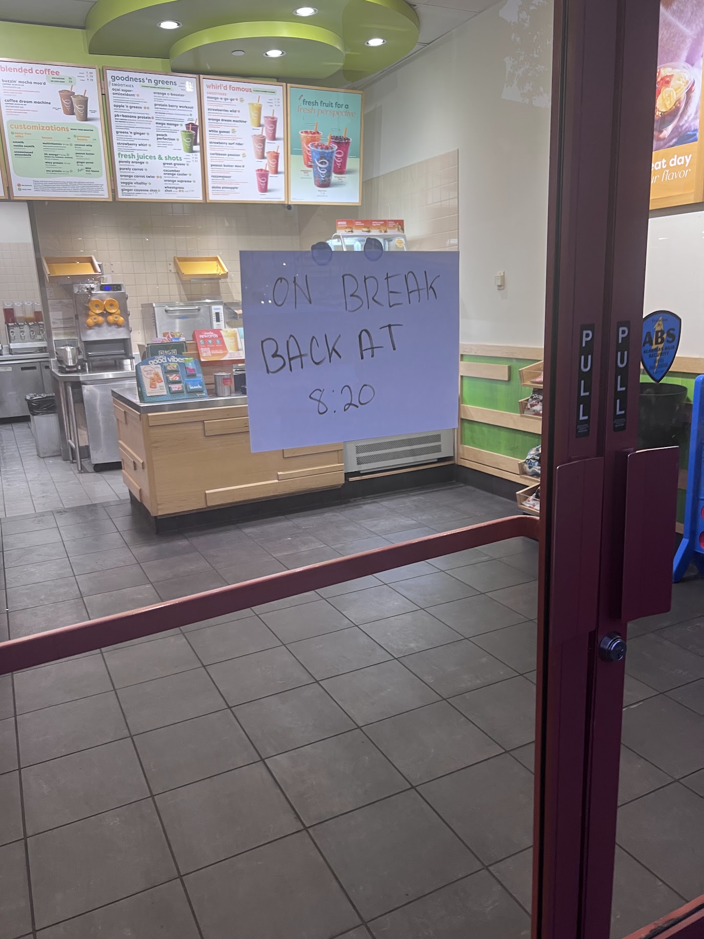 The girl pouring and making the smoothies is clearly not happy to be here. Iām assuming sheās the manager since sheās not wearing a hat. Thereās handwritten signs all over the place. This is super tacky.