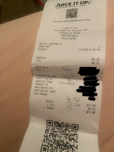 I left this location at 6:30PM today. I was helped by Jennifer R + her colleague, whose name I failed to obtain (young Asian male). I ordered a regular sized açai berry bowl. When I got my order, there was no banana. There was an excessive amount of blueberries. I was fine with paying 50 cents for them to add the topping I requested in the first place. My only request was that he re-make the bowl. This could easily sound unnecessary to the next person. Luckily I’m not looking for agreement on my preference as a paying customer. The male employee said, “I’m just gunna put it on top.” I asked if he could just re-make it? He said, “I don’t understand, it’s the same thing.” I currently work in both the food industry and medical field. I have a great level of respect for these occupations. But it also grants me sense to know, that these are not the types of responses nor interactions that maintain the quality and consistency of a business. I requested a refund + a refund receipt. Jennifer R quickly passed me a receipt. I explained that this receipt does not confirm a refund. It’s a regular receipt that simply says I purchased a bowl at 6:24PM. Jennifer R said that if I don’t get my refund In X amount of days, that “I could just come back and explain my story.” I got Jennifer R to at least sign the receipt she gave me. I hope this stands up if I have to come back. Just to top it off…. I was the only customer in the store that entire time. Meaning that, my request wasn’t affecting absolutely anyone’s time except the employees that applied & secured this position at Juice It Up. They chose to be combative instead. This...