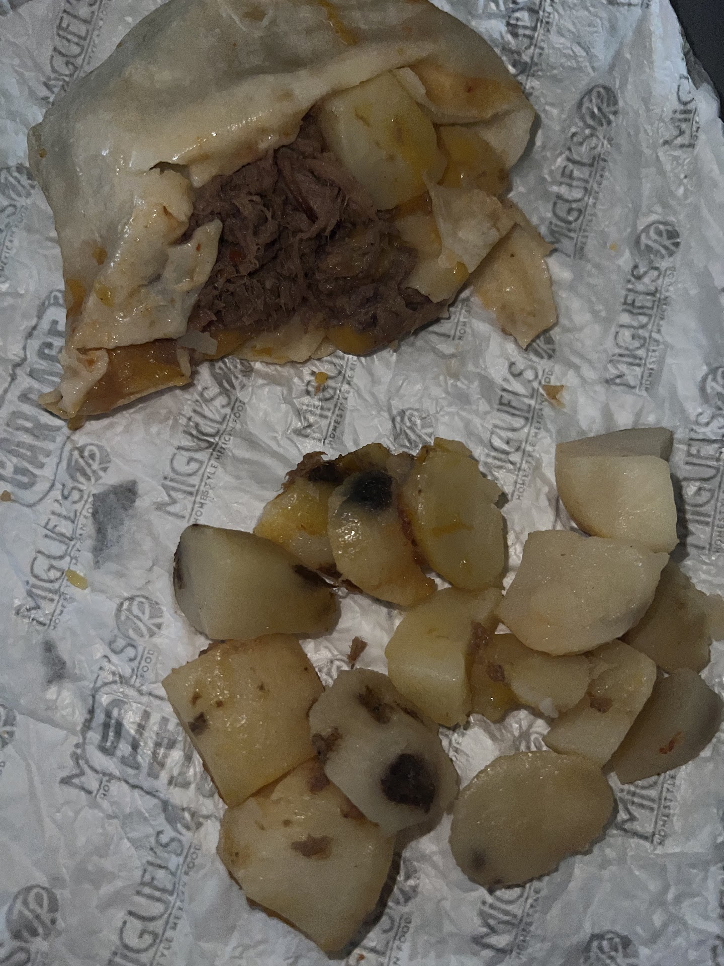 I am so disappointed with this Miguel's Jr. I have been coming to them for 21 years, and I was there yesterday and I got very sick from their food. I always ask for a vegetarian combo, the potato taco combo with beans and rice and everytime I get it, it always has a few speaks of shedded beef. Last night, I found some meat and fed it to my dog. The other taco I had already added guacamole and ate it without examing it. I paid for it last night and had to get up three times to use the bathroom and vomit. I haven't eaten meat for 7-8 years and they don't care about their customers that don't eat meat anymore. When I order I always tell them with no meat and everytime I find meat stuck to the potatoes or taco shell. They say that they don't preoare it with meat, so why the hell is there meat in my food! It is obvious that who is preparing the food is sloppy with cross-comtamination. I have spoken to them twice in regards to the sam issues and it keeps happening. I tried calling today, buy got answering machine twice. I am never going to eat there anymoe. It is not worth getting 🤢...