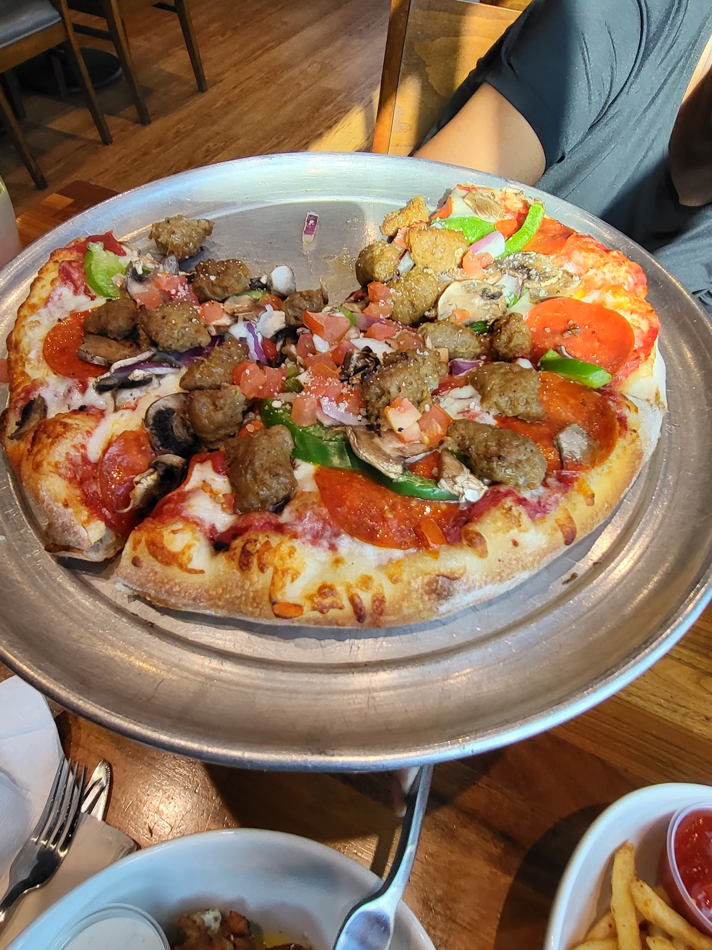 Read moreAbsolutely incredible experience. Upon arriving at the restaurant on a cool Saturday night we were seated by a very polite and sweet waitress who asked us for our drinks and I myself ordered a coke. The coke was a great standard coke: fizzy, sweet, and deliciously chilled and was great while I waited for my food. While waiting for my food, I absorbed the atmosphere and it was quite nice. People were cheering for the sports teams on the TV and everyone seemed to be having a great time. Very chill vibes and I enjoyed the time there with my family. We had some chips and salsa while waiting for our main dishes and I have to say it was quite delectable. The salsa had a nice tomatoey taste with a sharp jalapeñoey punch to it that keep me satisfied while waiting for my food. For my main dish, I had ordered the baked potato pizza and let me tell you I was beyond glad I had decided to order this pizza instead of what I was originally going to get. Upon the baked potato pizza being placed on our table I knew I was in for a treat. An incredibly immaculate sight, the pizza was blessed with the touch of God with its deliciously savory blend of 4 cheeses, topped with crumbled bacon, crunchy chives that really added a kick to the pizza, flavorful sour cream, a pretzel like bread crust, and best of all covered all in wonderfully crispy potato wedges. Each bite I took of this pizza felt like I was entering heaven for a second as my serotonin levels went through the roof as I consumed this godsend of a dish that sent me to cloud nine for the whole time I was there. I really could not get enough, but I was full after two slices after I also had their perfectly crisp french fries. After eating my main course I had ordered a brownie and it came covered it chocolate syrup, powdered sugar, and whipped cream. It was rich, chocolatey and gooey. Never have I felt so happy and joyful from eating food alone. I am absolutely in love with the food there to the point of actually almost feeling a romantic connection to the food. I am going to have dreams about the food and am going to gorge the three slices of baked potato pizza left in the refrigerator first thing in the morning. 10/10 experience would definitely recommend the baked potato pizza and I am definitely coming back here...