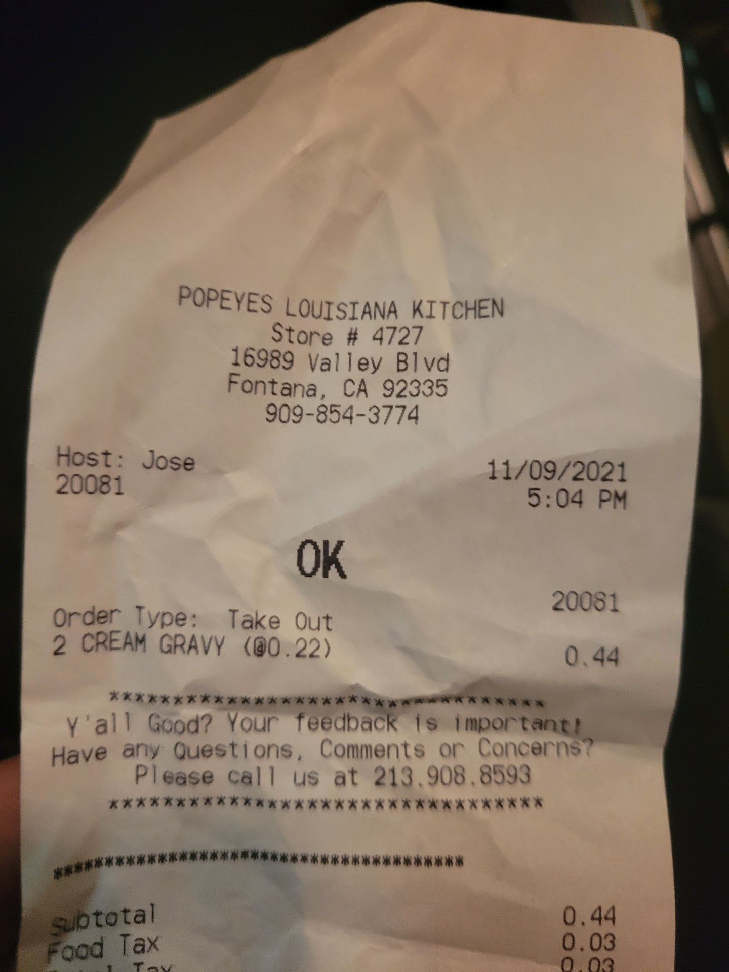 I could care less about the 50 cents if it was a standard practice at the chain... but this is not normal. Their penny pinching has earned them a bad review and one less customer. Go to a real popeyes somewhere else for...