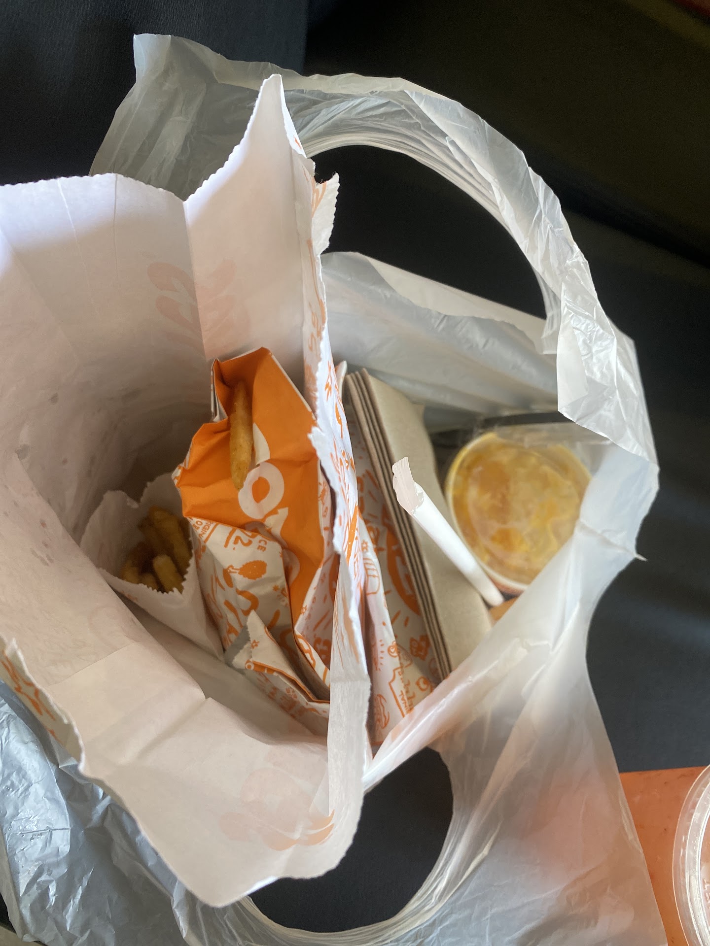 We were running out of time so we were not able to finish eating all our food-we ended up getting a box. The staff gave a box without a plastic bag so I advised my daughter to sit down and I'll be the one to ask for it which I did. Sorry but I had to. I got a toddler and it's easier to carry it in a bag rather than in a box.