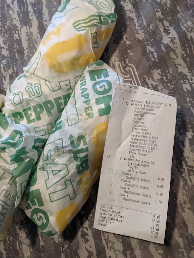 I very much enjoy the meatball marinara with honey oat bread, pepperjack cheese, toasted, spinach, cucumber, tomato, and lettuce. I also get a bag of nacho cheese Doritos, a cup of soup, and an Arizona tea. Another good option is the roast beef sandwich with italian bread, provolone, swiss, parmesan cheese, with pastrami, toasted, of course, and mustard, mayonnaise, salt, pepper, vinegar, olives, jalepenos, and a bag of ruffles cheese and dr. Pepper. I also get breakfast there for my kids. They enjoy the steak, egg, and cheese with flatbread. Sometimes I grab a few cookies when I'm at the register. They have oatmeal raisin, chocolate chip, and macadamia...