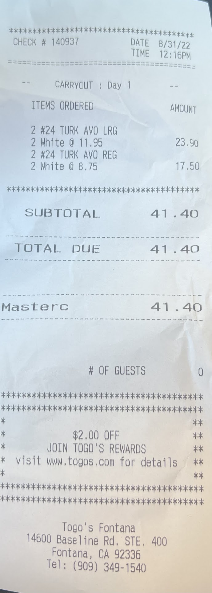 Read moreOrdered Togos online on Sunday 4/25/2022. Spent $61.16 total which included DoorDash and tip, etc… Togos didn’t check the name on the food order with the name the DoorDash driver had and ended up giving to an entirely different driver than the one assigned to my order. I never received my food at all!!DoorDash canceled my order and assisted in helping get a refund that day. No manager was available, so I went to Togos in person and spoke with a shift lead, no manager or owner came out to speak with me face to face. Told by the shift lead that the owner was aware of the situation because there were emails sent to the owner from DoorDash. The young lady took my name and number and told me that I would receive a call from the owner that the refund was done. That was yesterday Monday 4/25/2022, it’s now Tuesday. How long does it take to “log in” as the shift lead told me to perform a refund. Now the $61.16 has posted to my account no refund and no phone call. I was lied to and now I have contacted my bank to make a dispute. Will NEVER order from this Togos again!! I guess my patronage wasn’t important enough to correct so that I would consider spending my money with them again, even though it was...