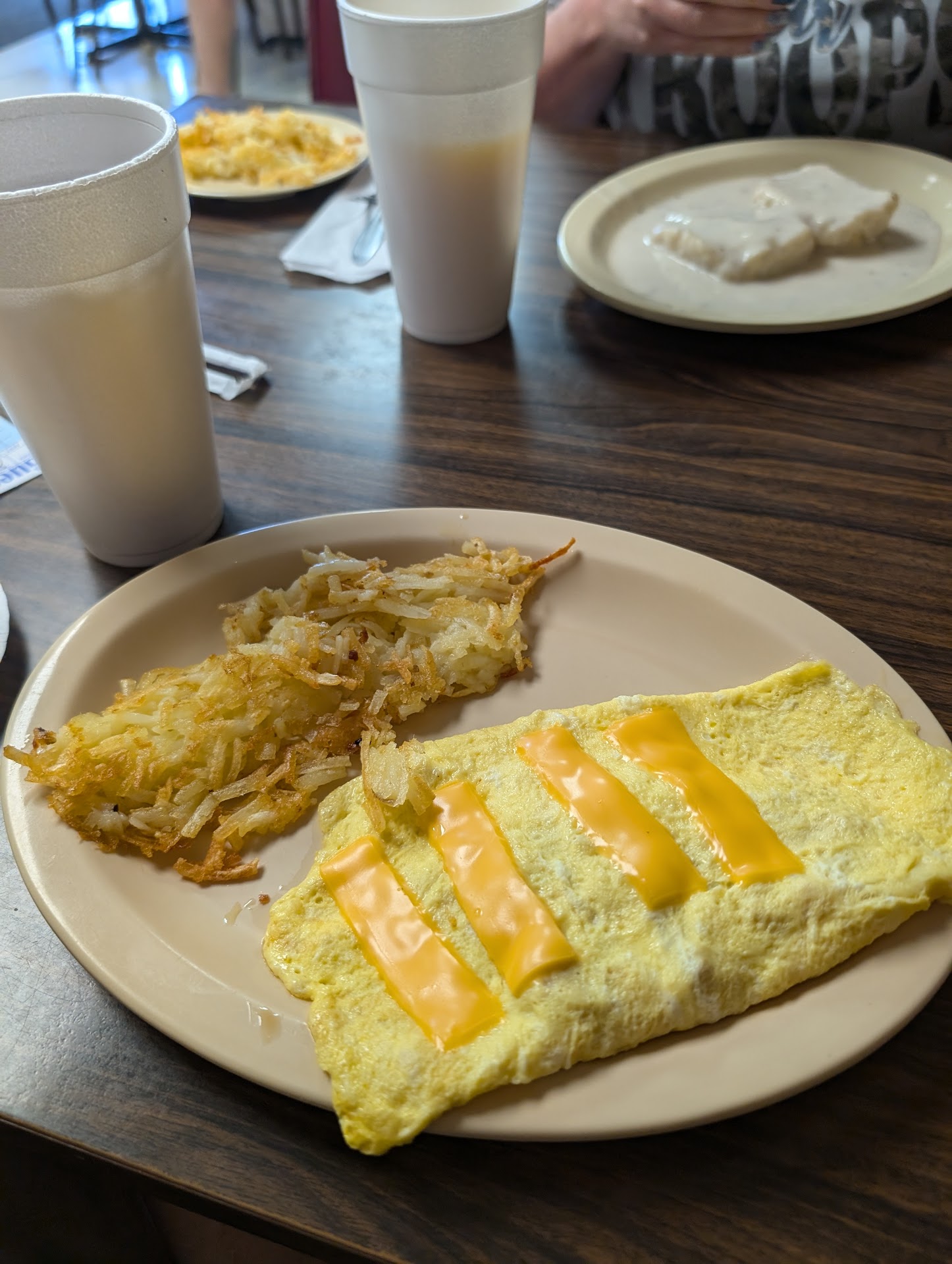 Our food was lacking today. We both got omelets today and our cheese was not melted. The omelet itself was only warm not hot. We also had grits and they were not hot. You had to break the crust to stir them. As far as butter that was some kind of spread that never melted and tasted like plastic. The girl that waited on us was great and very friendly. No complaints about service. The atmosphere is never so great. There's a young guy that works there and he speaks very loudly. It's impossible to go there and have a peaceful meal. Today there were 2 older gentlemen in separate booths listening to new clips on their phones and they must have been hard of hearing because everyone could hear their phones. They have a sign that states they are not fast food. If that's the case your food should be hot...