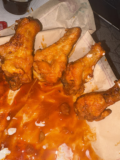 Read moreI was pretty disappointed in this place first off I came to pick up my wings checked into ny spot and waited outside forever…… after waiting over 30 minutes I went inside to find my food sitting there on shelf and staff just sitting around. I told the guy how long I’d been waiting and he just didn’t even acknowledge me and threw my bag at me. I took my food back to the hotel and it was all thrown in the box on top each other curly fries burnt and soggy with wing sauce cover all over them. I was not given any silverware or even a straw for my drink that wasn’t even the right drink I ordered. The only thing half decent was the wings however the sauce was not on my wings but more on my fries. I’m not a picky person but I was very disappointed with the service I was given and the quality...