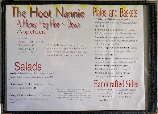 Ā Ā Ā Read moreI was VERY disappointed in this place after being excited and waiting for it to open. We don't have a lot of options in Forest City so when I saw that the Hoot Nannie was opening I knew I wanted to take my husband and two daughters there this past Saturday (3/19/2022). My family doesn't like to try new restaurants, so convincing them to eat here took a lot. We waited until like 2:45 before we arrived so the lunch crowd would be pretty much cleared out. I was right it wasn't crowded so I thought we would get seated right away.... NOPE! The hostess was doing the waitress job cause all the waitress were in a corner talking and the owner was "smooshing" a table of people, I assumed he must know them. He saw us several times waiting but never seated us. After 20 min we finally got seated. It took the waitress another 20 min to take our drink order, by the time she came back with our drinks we made it simple. One daughter ordered tenders with Mac n cheese the other daughter, tenders and fries. The husband and I ordered Cuban sandwiches he got fries I got homemade chips. It took 45 min to get food only after I said we were leaving did the food appear. My daughters fries were ice cold the others mac n cheese was floating in a bowl of grease and the tenders were greasy/slimy. The husbands Cuban was luke warm and my chips had like a pound of salt on them....could not eat but one. When I told the waitress she said sorry nothing she could do. The owner was still talking to the table of people he knew. He heard me get loud about the food and not once did he come over to see what he could do. I WILL NOT be back and I have told several friends and family to not go there, I had such...