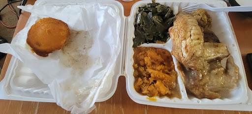 Baked turkey wings with gravy and stuffing- the skin on the wings was soggy like it had been reheated from yesterday and the meat dry. It came with I believe 2 or 3 pieces and I was only able to eat the meat from one. The amount of gravy was sad, especially because the skin was so loose, I thought the meat would be moist, it was not, and had a lot of feathers still on it. There was no gravy in the bottom of the container, so I had to scrape it from the wings to put it on the stuffing. The candied yams were interesting, good but had too much honey, needs a different sweetener, also kinda tasted like they came out the can. The greens were bitter and slightly under done. The stuffing, then the candied yams were the best things I ate. The sweet tea was very good, but it needs more tea bags.