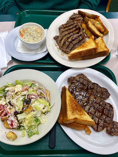 If you order a salad you are at the mercy of whomever is manning the salad bar. First I didnāt know that my salad was from a salad bar and that being the case they should ask you what you want on it or make it generic. Mine had black olives, green peppers, eggs, beets, tomatoes and a smidge of lettuce thrown in for good measure. I just wanted a generic salad. The Ribeye was the worst piece of steak I have ever had. It looked like it had been run over by a truck. It was so grisly and tough most of it went to our dog. The baked potato was ok small but tasty until I found out my husband was charged .95 cents for a small tube ( maybe 2 tsp) of the sour cream. That is a staple for a baked potato but obviously they need to get every penny from you. Last I didnāt realize I got Texas toast. I was so excited until I took a bite. It was greasy and the edges were hard. We only live about a mile away so there was no excuse. My husbands burger was a bit over done but he said it was acceptable.