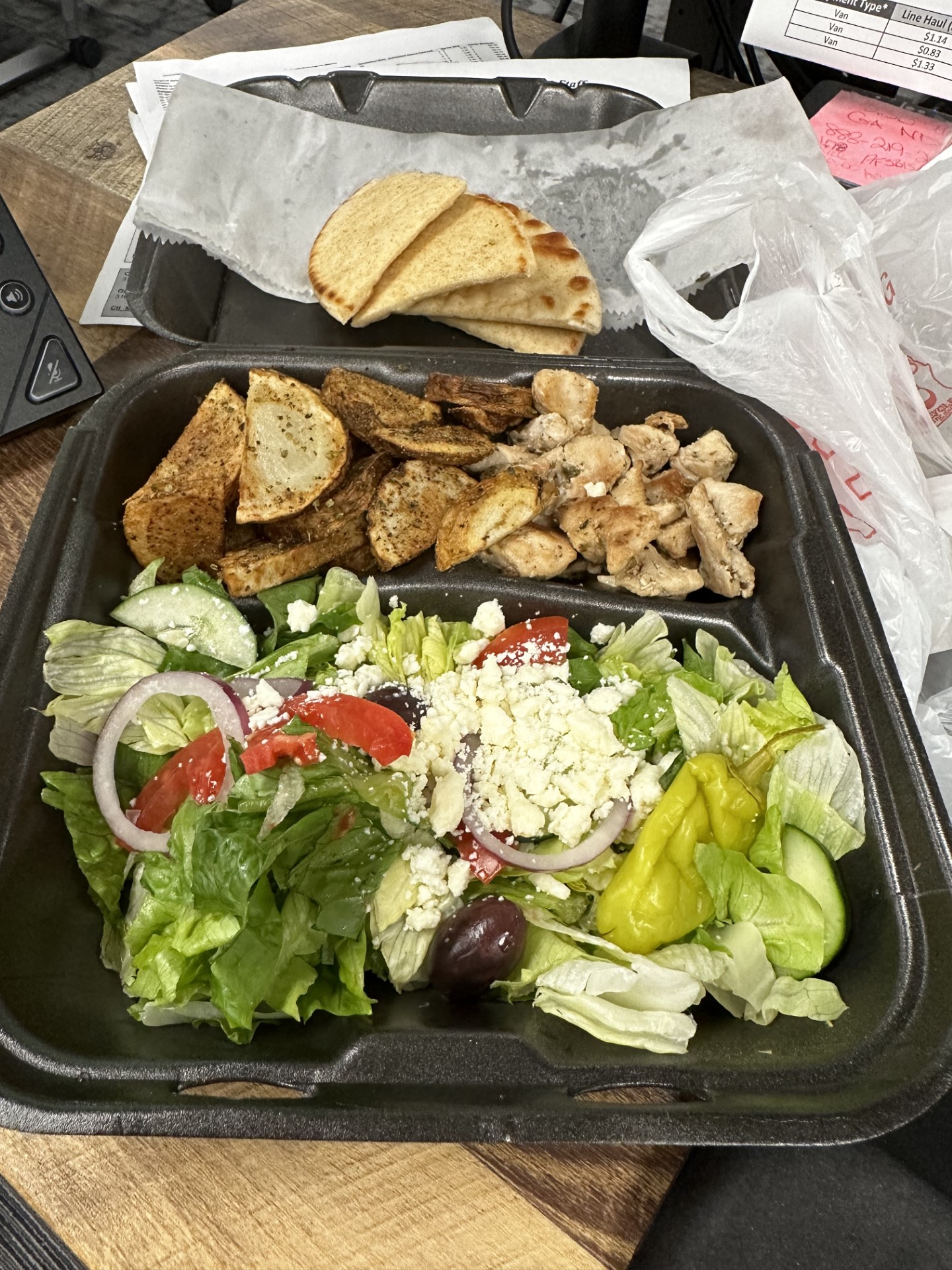 Read moreI ordered the gyro plate with the side salad and potatoes, as well as a drink. About $12 total. Let me say there were enough potatoes for my 3y/o and I to both eat and still have some left over for a snack later, and they were good! The salad was tasty with a tangy, velvety, oil based dressing, and we both ate that all up! I ate the gyro myself, and they were generous with the meat, tomatoes, onion and Greek sauce (all of which comes standard on the gyro). I asked them to wrap it for me, and they did so well I was able to eat it with minimal mess despite the copious amount of deliciousness they managed to fit inside it. Honestly, just the gyro would've been a meal in itself for me, but really glad I got to enjoy the potatoes and salad too. The staff, tho busy cooking, immediately acknowledge me and apologized for the wait (less than 3 minutes). I highly recommend this resturant's location for service, value and food! Also, my order was ready to go before I finished filling my drink, so fast and good for take-out, or small...