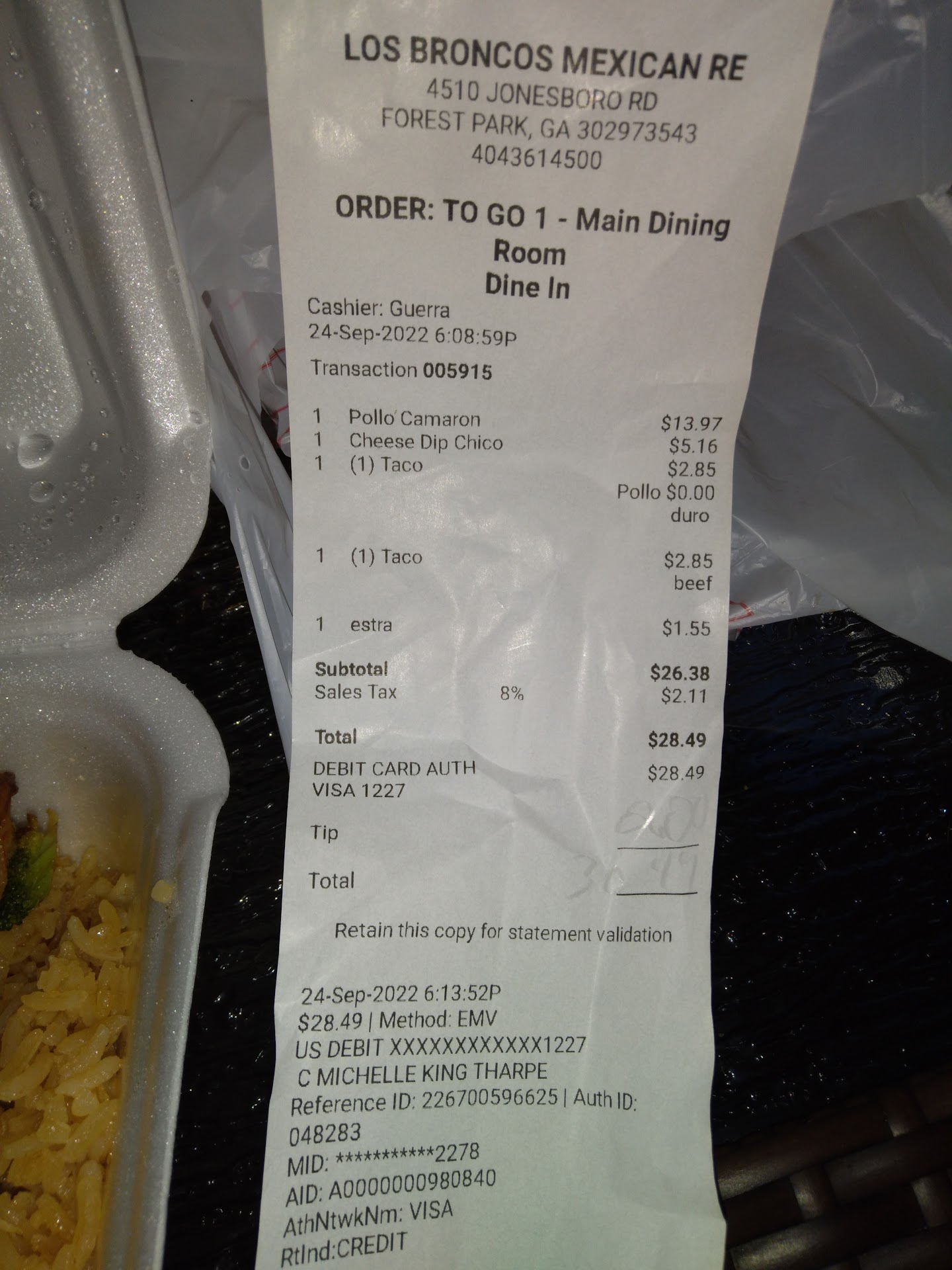 Read moreI've passed this place many times and never really gave it a thought, but today i searched Google for a Mexican place near me and to my surprise I was directed to Los Broncos..I ordered the shrimp chimichanga to go and it was delicious 😋(as you can see in the photo)and reasonably priced. The only slight negative and I do mean SLIGHT, is I wish the chimichanga was more crispy. The service was great and the young lady helped me with terms that I did not understand. I would definitely order that dish again even if it was not crispier. Wish I had taken a picture before I devoured the food😂😂😂. For those who gave a negative review maybe they were having an off day. But my entire...