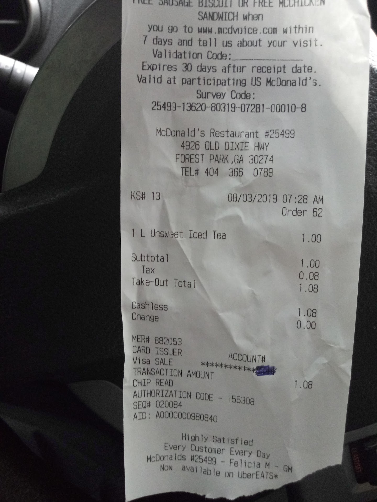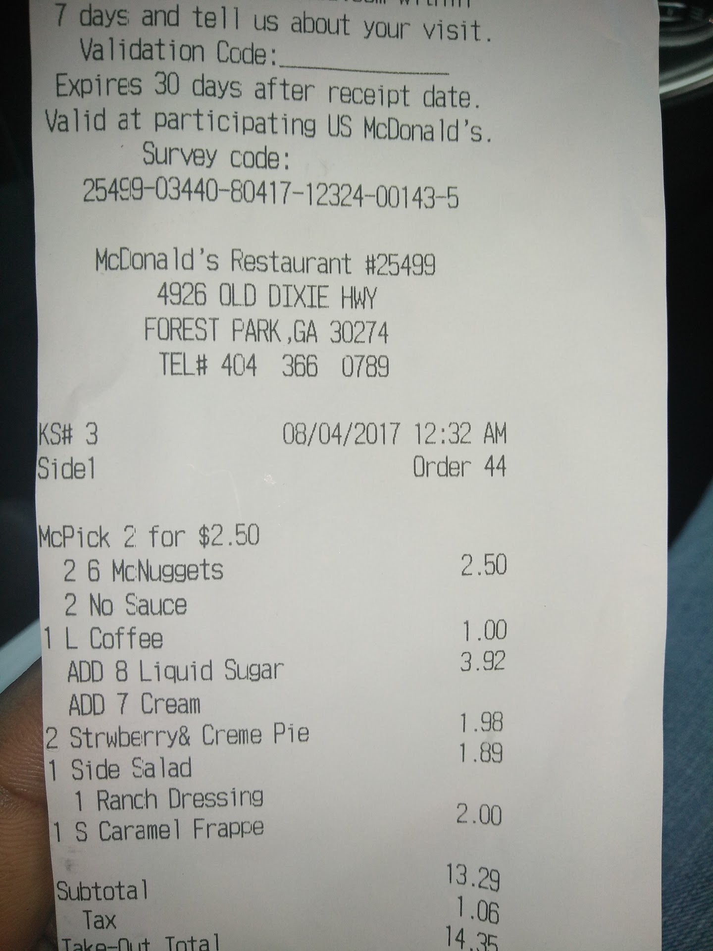 Read morePlease check your food!!! Plus- speedy service Minus- food order may not be correct-but fast Plus-plenty of staff Minus-staff not educated on customer service (especially 7am 6-7-17 day shift manager) If I could give 0 star(s) I would unfortunately that option was not available Based off our conversation at the drive thru window over a $5 sandwich... She questioned me as if I was making this story up. About this $5 sandwich they still had in their possession when I got home last week she took my name and put it in the "book"...not 1 time did she say please retain your receipt... Or my name is such and such, I'm thw manager please remember it or write it down.. Sooooo when I went there today First question she asked- do you have ypur receipt? I said yes and produced it. Next question do you remember who you talked to... I said no the lady over the phone said "I am the manager and we have your sandwich RIGHT HERE" I'm thinking what good is that going to do me I'm now at home after doing a 12 hr shift I can't drive back because I'm so tired forget it... O this is just protocol we have to do it the correct way. Ok I understand that but why not inform me of this protocol when we were on the phone last week instead of making me feel like some kind of theif and acting like this $5 was coming out of her pocket... Smh...visit at ypur own risk... Side note: Not the first time they gave me incorrect food... 3rd times a charm... You will not get me again... Hahaha... You got me... jokes...