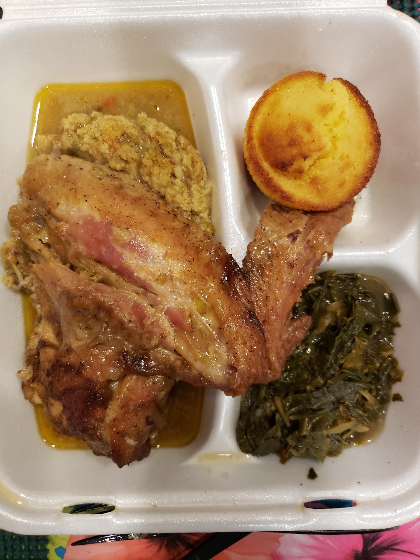 We ordered 2 dinners of smoke turkey wings, one with rice and two sides, macaroni and candy yams. The other dinner plate had dressing instead of rice, and the two sides were collard greens and potato salad. It was very tasty, the meat fell right off the bone. The sides items were authentic and made fresh, definitely not from a can. We ordered 2 Rays special punch and peach cobbler and banana pudding but were so full were going to have that tomorrow but we dud taste it and it too was delicious. The prices are reasonable.