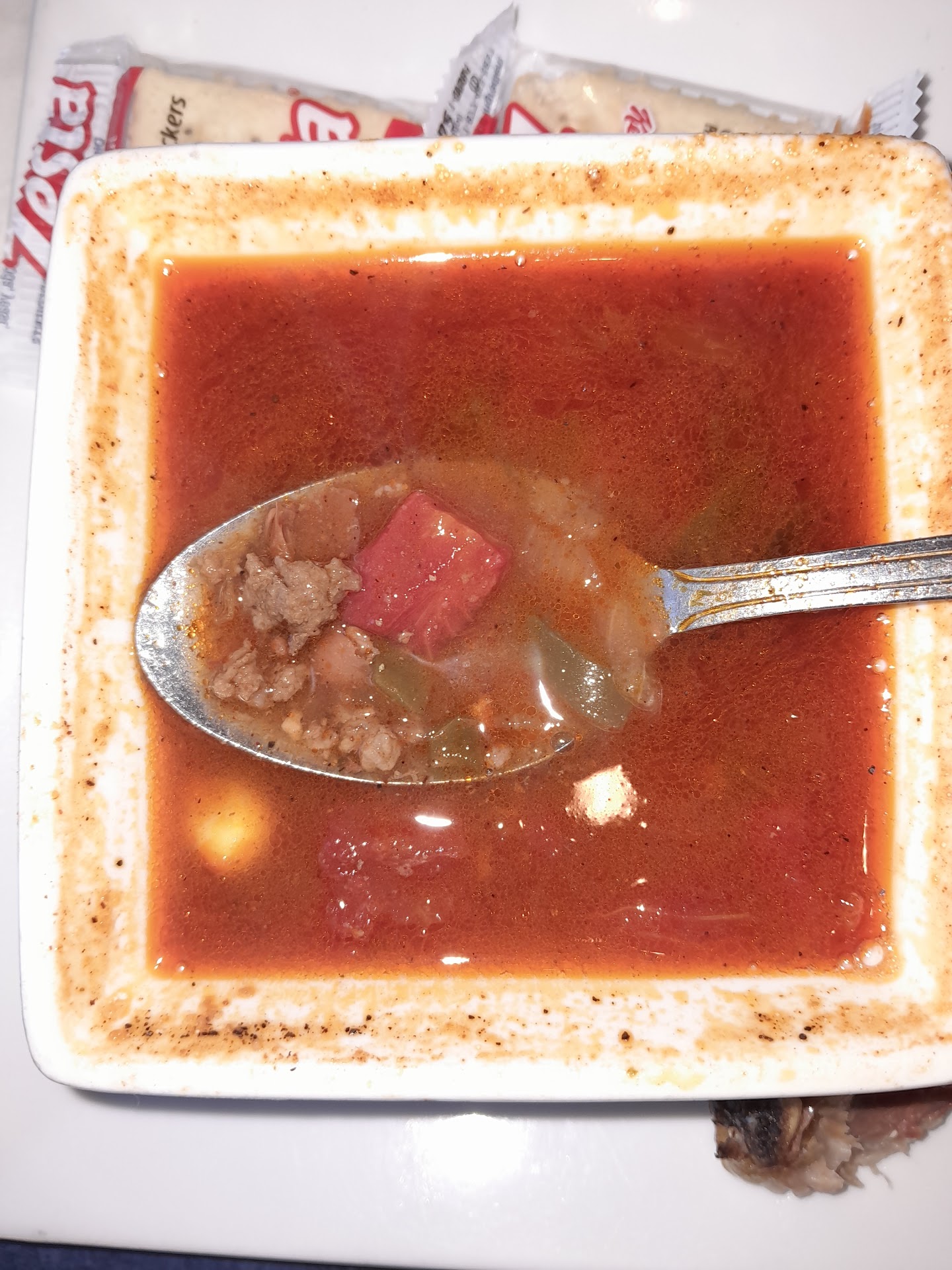 Dinner: I ordered plate of fried catfish, mashed potatoes w/brown gravy, carrots with a side bowl of taco soup & another plate of catfish, cabbage, macaroni & cornbread. I had to add salt and pepper to the mashed potatoes the gravy was bland with little or no seasoning. The carrots taste like they came out of the can with sugar added. The soup tasted like canned vegetable soup with hamburger meat added. The cabbage was watery with no seasoning, the macaroni did not have any seasoning had to add salt and pepper.