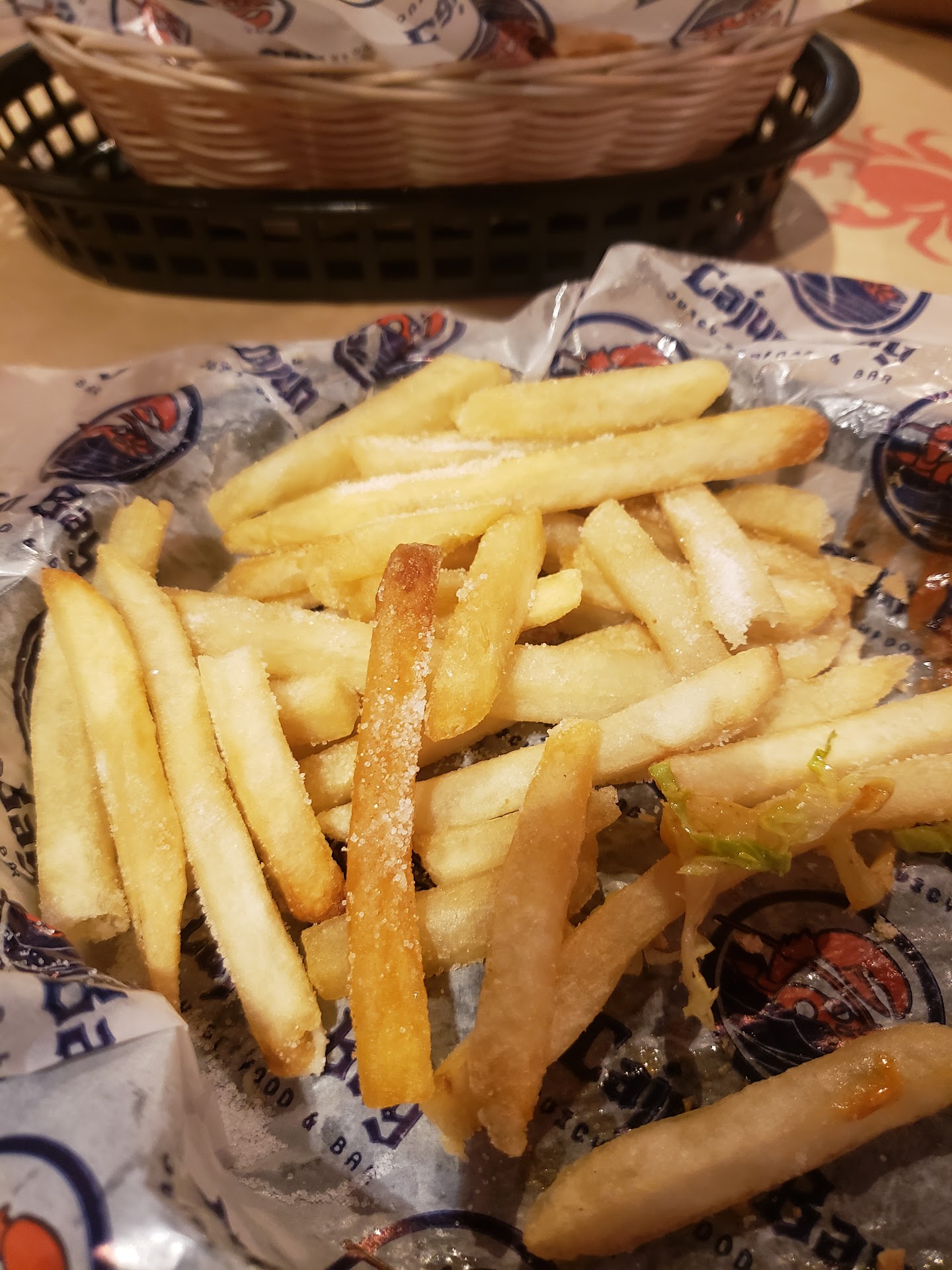We asked our waitress what a few menu items had on them or what it was and the waitress had to go ask, each time. Sometimes she would come back with an answer, sometimes she wouldn't. This was one of those open mind things because we know it's new. She took our order... fried shrimp basket, fried fish basket, and shrimp po boy! We got our baskets within 10 min of ordering, but our son's Po Boy came out 20 min after ours. Wouldn't have been too much of a problem if we would have just gotten it all together, but people next to us were getting their appetizers and the entire meal before my son got his sandwich which the only difference between ours and his was bread and lettuce. The shrimp and catfish had zero seasoning and it honestly tasted as if it was from the frozen food section at the grocery store. My son's Po Boy was good and it did have the fried shrimp in it, but the bread lettuce and the sauce took away the frozen food flavor and it was decent. However, the fries he got were covered in so much salt, he couldn't eat them. The fries in the basket were a little cold, but the shrimp and fish were hot...so that's a plus, I guess.