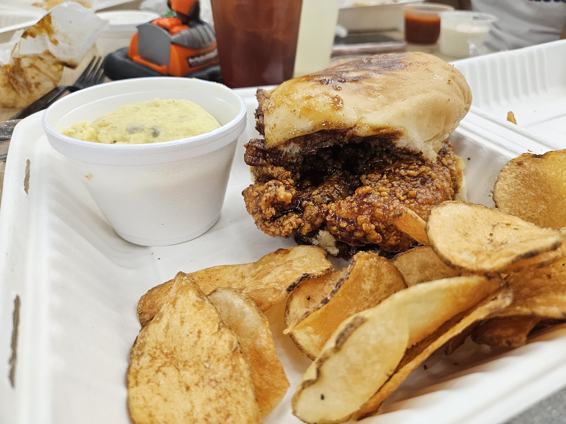 I placed my first order on a day I'm not feeling well. One bite of my Pulled Pork sandwich , French Fries , a sip of my unsweetened watermelon Lemonade and Jumbo Chocolate Chip Cookie . I haven't felt well the last two days . I needed to eat so I could take medicine. I placed my delivery order 2 hours before they stopped taking orders . I was thankful and surprised to see 👁👁 reasonable prices . Keeping it 💯 didn't put my hopes up too high because of me being ill. It's a miracle I ordered a meal with dessert 100% satisfaction. I requested my Pulled Pork sandwich with no barbecue and no side order of coleslaw. The meat 🍖 was very tender and seasoned well. The fries were crispy .The Jumbo Chocolate Chip Cookie was jumbo sized . It could be shared with others which is never my goal 😊. The cookie was moist and easily breaking up. The unsweetened watermelon 🍉 Lemonade was lit . I noticed the flavor separation with a watermelon 🍉 spear in the take out...
