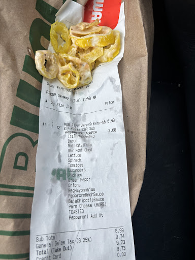Read moreWent in and ordered the selection of meat was fresh the baked chicken got to choose my favorite bread which was the Italian parmesan and three cheese it was just wonderful toasted that along with the cheese just made it mouth watering put the vegetables on which were fresh and crunchy added the dressings and toppings to finish off the sandwich and it was excellent I was able to get all of this on a foot long added chips and a drink and was still able to get all of this for under eight dollars which was unexpected. I ate inside and the restaurant was clean the tables were clear and it was not crowded was able to enjoy my meal in peace without being bothered with a lot of people or noise when I finished I ordered a small little dessert which was a cookie and it was freshly baked and was delicious did a survey and was offered a coupon which will allow me to enjoy my next delicious meal at a great discount. one of the workers came over and picked up my tray and cleaned my table and even asked if there was anything else he could do to help me so all in all I would have to say that this was a pretty good experience for a fast food place and definitely not expected and that I will be returning to this particular place because I enjoyed everything about my experience here it is also a nice quiet place to take a date on a early afternoon outing....