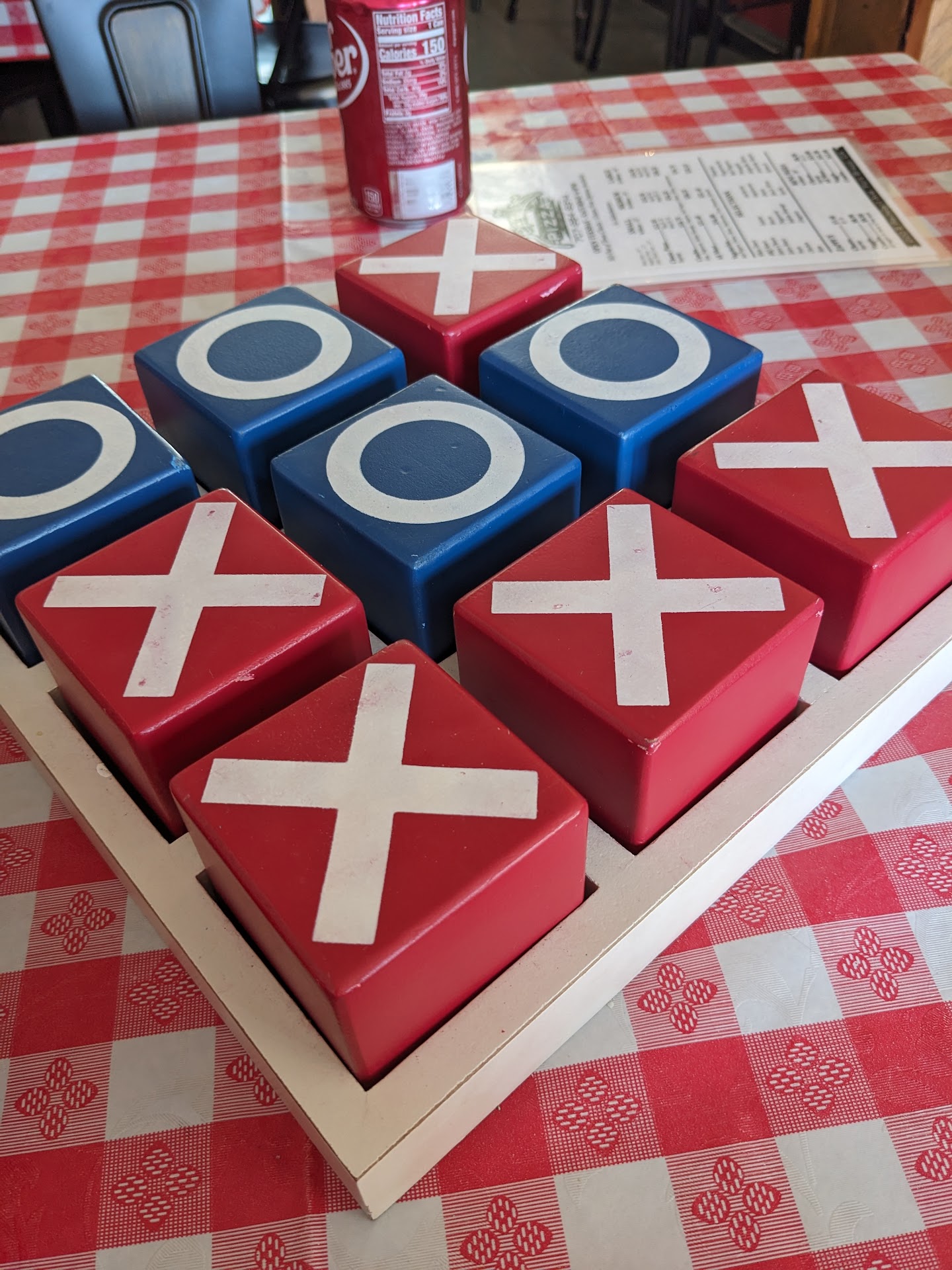 For our pizza choice, we opted for a Vegetarian pizza with white sauce and added artichokes. While waiting for our pizza to cook, we found a delightful wooden Tic Tac Toe game at our table, which kept us entertained and added a playful touch to the afternoon.