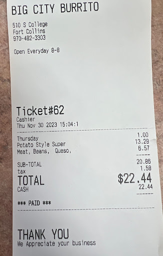 Read moreTried Fort Collins Big City today for the first time and was sorely disappointed. I have eaten at Big City in Loveland for years and it is by far superior employees and food taste. Multiple staff members started my experience with a sour attitude and disgruntled behavior as if she was annoyed with my presence making it extremely uncomfortable to share my order. The music playing in the background was full of profanity so I would not recommend this as any kind of family establishment. Typically I prefer my food to smell like the ingredients I ordered and not marijuana. The food at the Fort Collins location is completely different. I wouldn't even know it was the Big City I have grown to love because it is a very different flavor. The potatos were undercooked, ranch tasted like buttermilk, strawberry habanero was super bland and without flavor. I will ONLY eat at the Loveland location where they haven't figured out how to ruined a burrito yet. I know that both Fort Collins and Loveland locations have recently been bought by one owner. I just hope the new owner doesn't change Lovelands Big City's ingredients and flavor. Even though I live in Fort Collins, I will make the drive to have way better tasting food...
