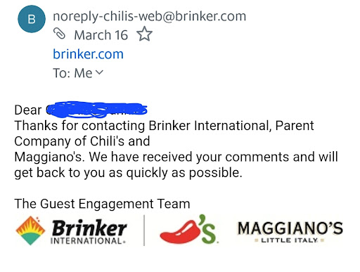 Read moreMy wife and I went to Chile's on Saturday July 1st, used bathroom before I sat down in booth, filthy dirty and it was obvious nobody had bothered to check its condition for quite awhile. Our server was pathetic, he seemed to be distracted by the 3 girls at table at front of section. We ordered the skillet queso and Chips & salsa, the queso was crusted over and cold. (It came 5 min after salsa, server said it was cooking), we both ordered the 4 piece chicken Strip dinner. I substituted the Mac n cheese and fries for side salad and street corn,,,($1.00 extra for each). The dressing was watered down, cucumbers were squishy ( needed to be thrown out a day or two earlier) the salad itself was wilted and unedidible. The street Corn was so soggy it made a water puddle on the plate, no skewer to hold it and therefore the seasonings were all over my hands,so soggy it took one bite and left it on plate.. Chicken strips were greasy and ice cold, one was as raw in the middle (took picture and sent to health dept) I didn't eat much of my meal, wife's chicken was cold and grease soaked as well, her fries were greasy and soggy, Mac n cheese was cold and looked like glue, she didn't eat much either, server came by and noticed we didn't eat much and asked why. We told him the issues and he snickered and said "bummer " bottom line is Chile's has gone way down hill and menu has been dumbed down from what I remember from 2-3 ,yes ago. We won't be back ever and Chile's has Iost us as patrons. (The location we viisited is located on college Ave in...