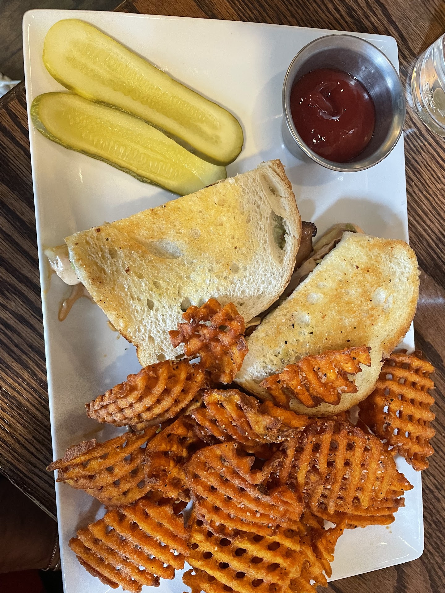 I ordered just the pretzel as I had eaten earlier, and my friend ordered a bison burger. The food came out very fast and we were surprised! But⌠mine was a sandwich and not a pretzel. I didnât say anything because I have social anxiety, but also it was loud and I figured maybe the waiter misheard me. He came back after like 10 min (at that point I just started eating instead of waiting for him) he came back and told us he messed up and gave us the table next to usâs order. That table had been there well before us so they were probably pretty mad too.