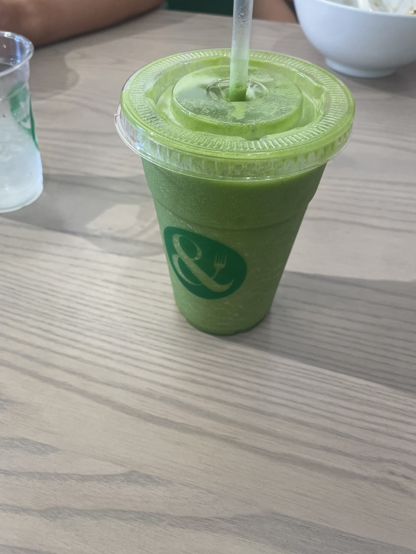 I got it without banana and she warned that it would be icy which I was fine with, but it was the exact opposite of icy. This was barely cold and tasted like a super thick green juice, along with stringy pieces of pineapple and mango.