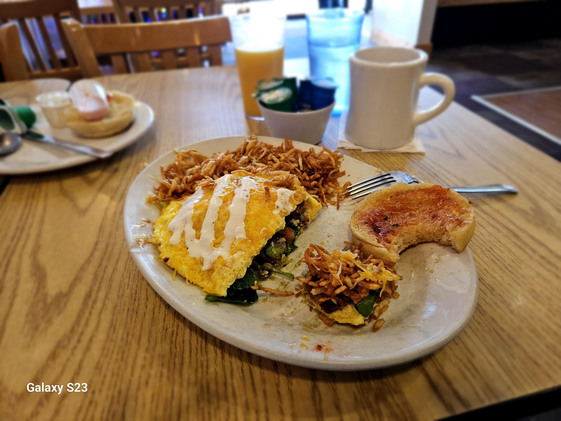 Read moreLunch today was disappointing. Ordered Sharon omelette. When asked what side I said hash browns, but then corrected myself and said home fries. Server brought hash browns that looked delicious, but were thick and soft inside, not like hash browns are to be cooked. Omelette has sour cream, but it was put inside and it made the omelette cold and watery, along with the veggies. The side of tomatoes tasted soggy and not fresh, and the English muffin wasn't toasted, but warmed up, and I didn't care for it but ate it because I was hungry. The homemade strawberry preserves were like dumping liquid on my English muffin, and when I picked it up to eat it, ran down my hand to my wrist. I ordered a cinnamon roll to take home for a coffee break. It looked delicious, was enough for two people and came with a tub of icing. Sadly, the taste was bland, chewy like bread, and nothing like a really good cinnamon roll would be. Service today was a bit awkward at first, with a new server training, who was a bit too eager to take our order. The server and trainer did get us all that we asked for eventually. The window blinds were lifted when we first arrived, making it very difficult to see at our table with the glare, chrome from cars, etc. The servers were gracious enough to move us to the back before our...