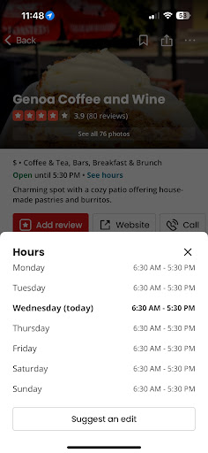 I came into Genoa Wednesday, April 23 around 2:30 PM. The first thing I want to say is that I was treated very poorly by your staff. The young man who was in the middle of making coffee didn’t even bother to say anything to me while I’m standing at the counter for 5 minutes . Not a simple “I will be right with you” No acknowledgement I even exist. Just completely ignoring my presence and yes he saw me. He then comes over with a face and makes zero eye contact while asking what I want while he’s looking at his phone. He seemed almost annoyed. I then realize he is preparing to put the order into his phone, but still ….. you don’t make any eye contact at all with a customer? I then ask about a cake that is right in front of his face on the counter and he responds that he doesn’t know what kind of a cake it is. How do you not know? There is nobody to even ask? To top it all off, my friend left her pocketbook on one of your outside chairs. We were halfway home and as we turned around to come back we frantically called your establishment to ask someone to please go outside and get the bag. That didn’t work though because you guys don’t even answer the phone. We left a message but nobody returned the call. This is actually the second time I have been treated rudely by your staff and ignored at the counter. You need more staff if you can’t have someone dedicated to the counter and nobody is answering your phone.