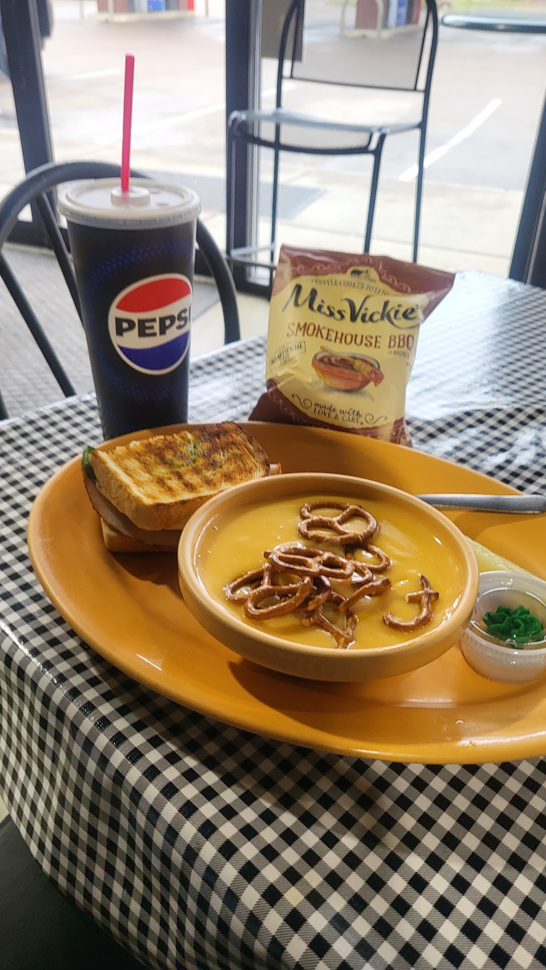 Due to a work contract nearby I went here 3 times in one week. #1 I called in a pick-up order of the Ciabbata-bing and they said it would be ready in 10 minutes. I arrived and they said they hadn't started it yet so I had to wait. Overall the sandwich was good although a bit lacking in protein, on par with the amount of meat you get at a Subway. The "cup" of soup I got, the tomato basil, was barely a cup, maybe 4 ounces although it was really good. #2 I came in and ordered a sunrise quesadilla with pulled pork. I took it back to my work site and when I got there I found out that they forgot to put in the pulled pork. So I had to drive back and get my pork. Thankfully they gave me a free meal card to make up for their error. The meal was really good partially because I got a lot of extra protein because of their mess up. #3 I redeemed my free meal card and ordered a Hot Shot with double meat and a bowl of soup. I also ordered barbecue sauce on the side instead of on the sandwich. They put the barbecue sauce on the sandwich instead which I didn't find out until like got to my work site. I decided I had enough of their mess ups and didn't want to deal with it. The bowl of soup was more like a cup, 6-8 ounces, and was ok. The sandwich was decent but not spectacular. I tried really hard to like this place, as evidenced by going there three times. However, they have a lot of kinks to work out, until then I doubt I will return. On top of that, for what you get for the price it's just not worth it, you might as well go to Subway and...