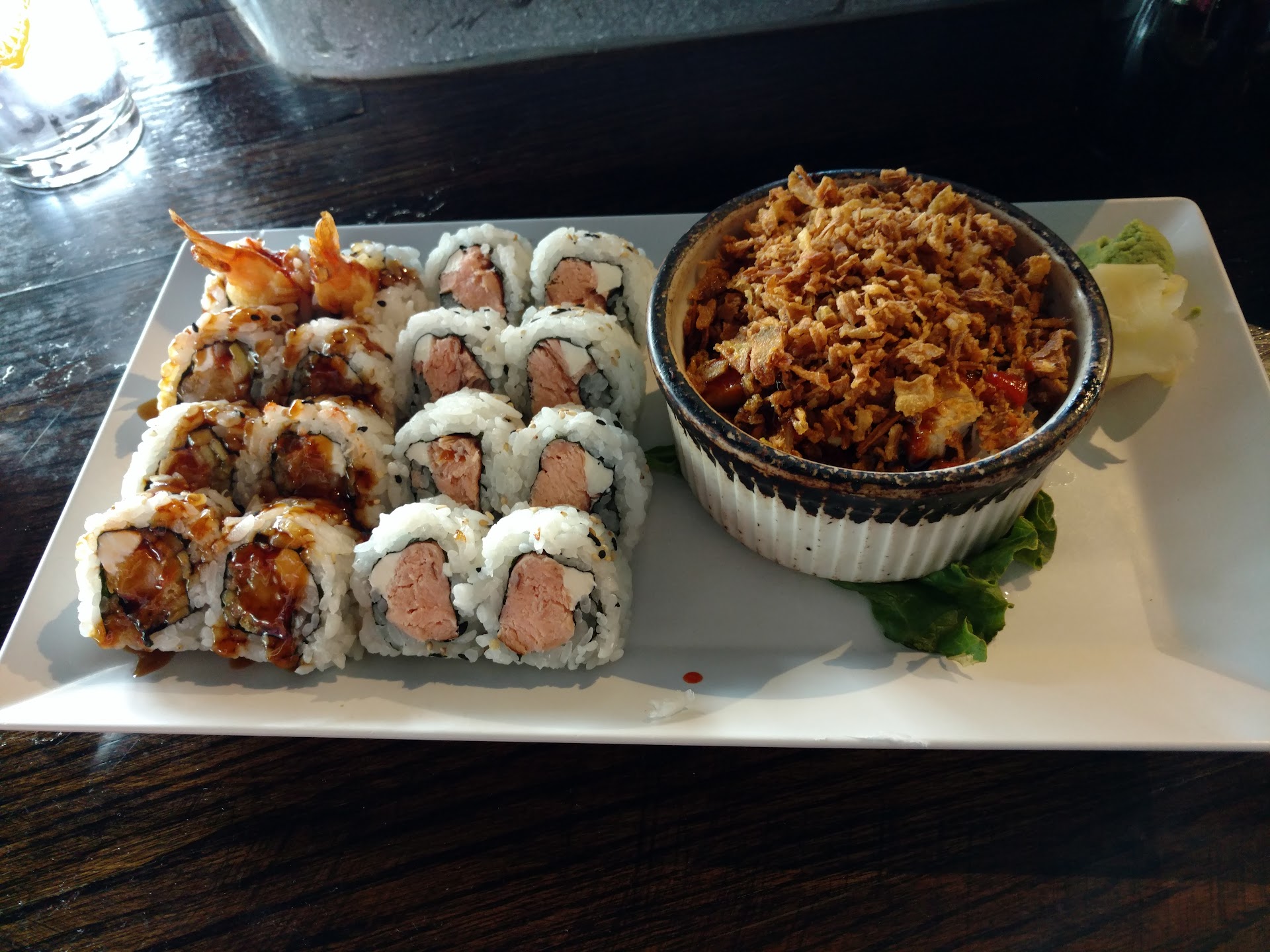 The indoor environment is fine. Typically clean. I’ve never had an issue with service. Though last time I was in there seemed to be too many people working at once, as 2-4 people were just standing near the entry way. I’m sure this was to take care of to-go orders but it was a bit odd. Also surprised they included a full bar instead of a sushi bar type seating…